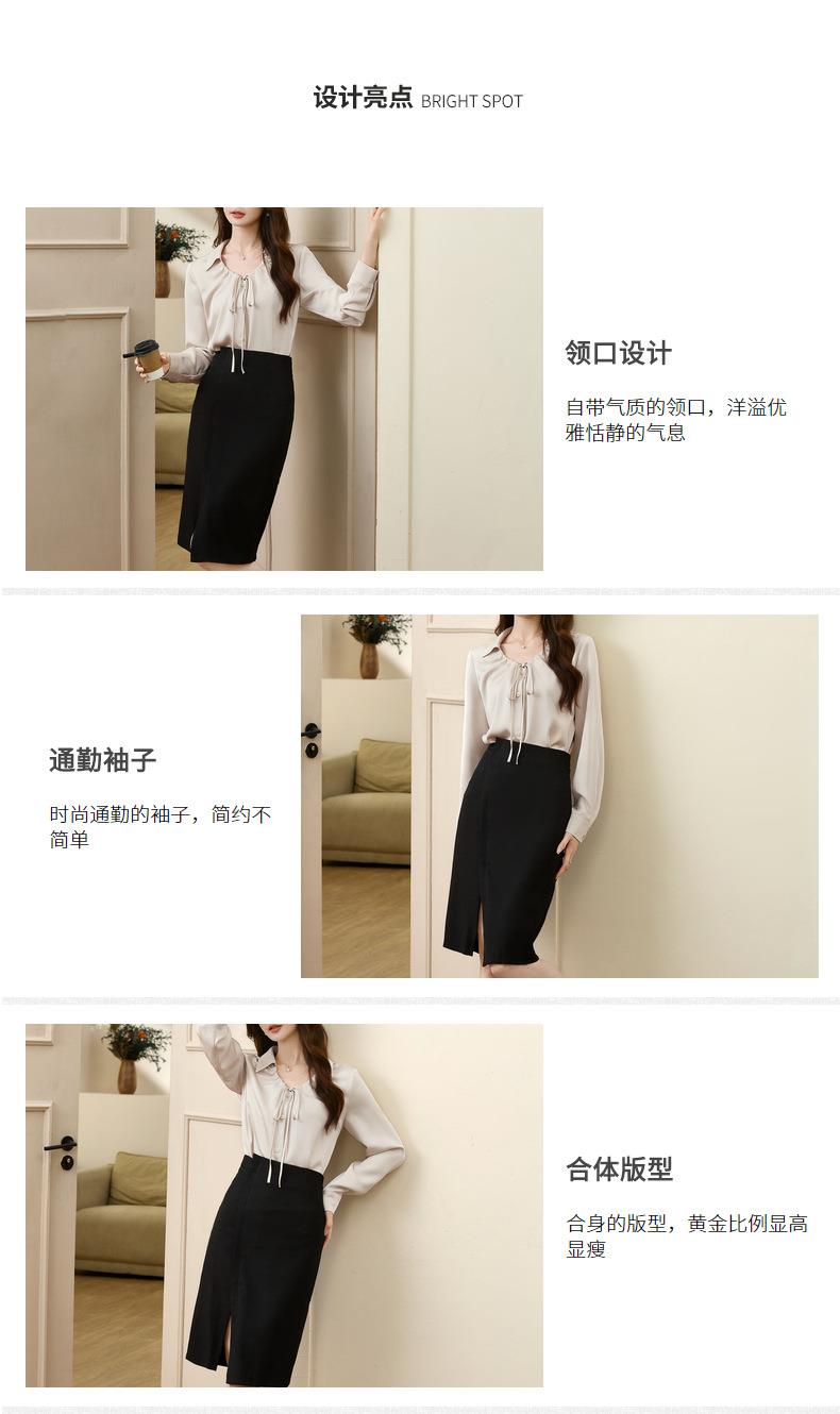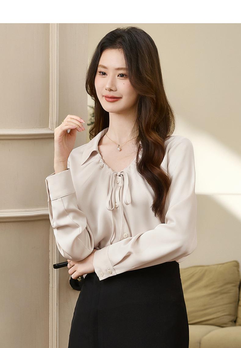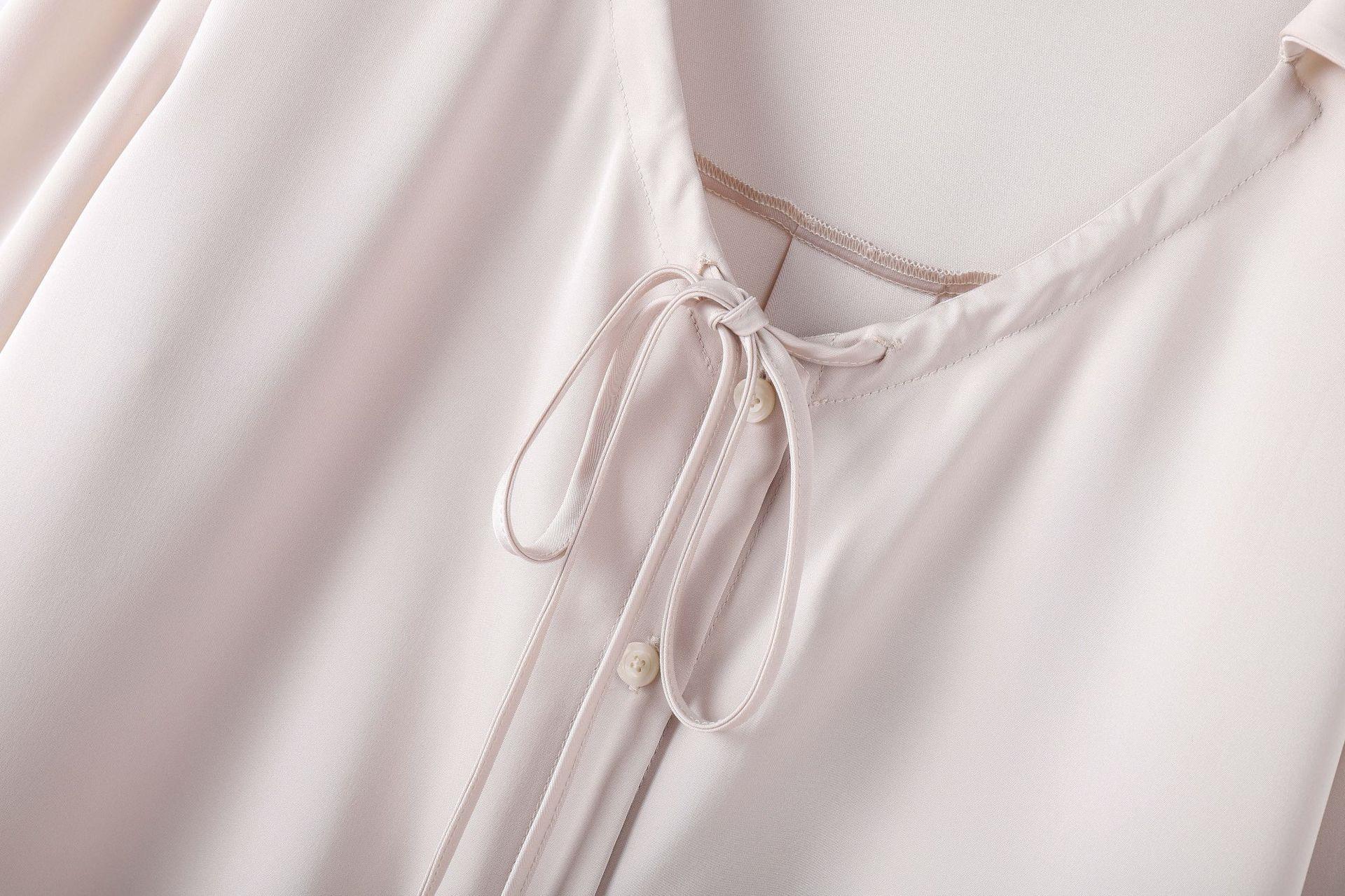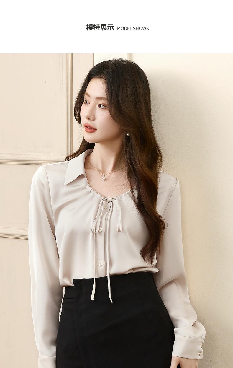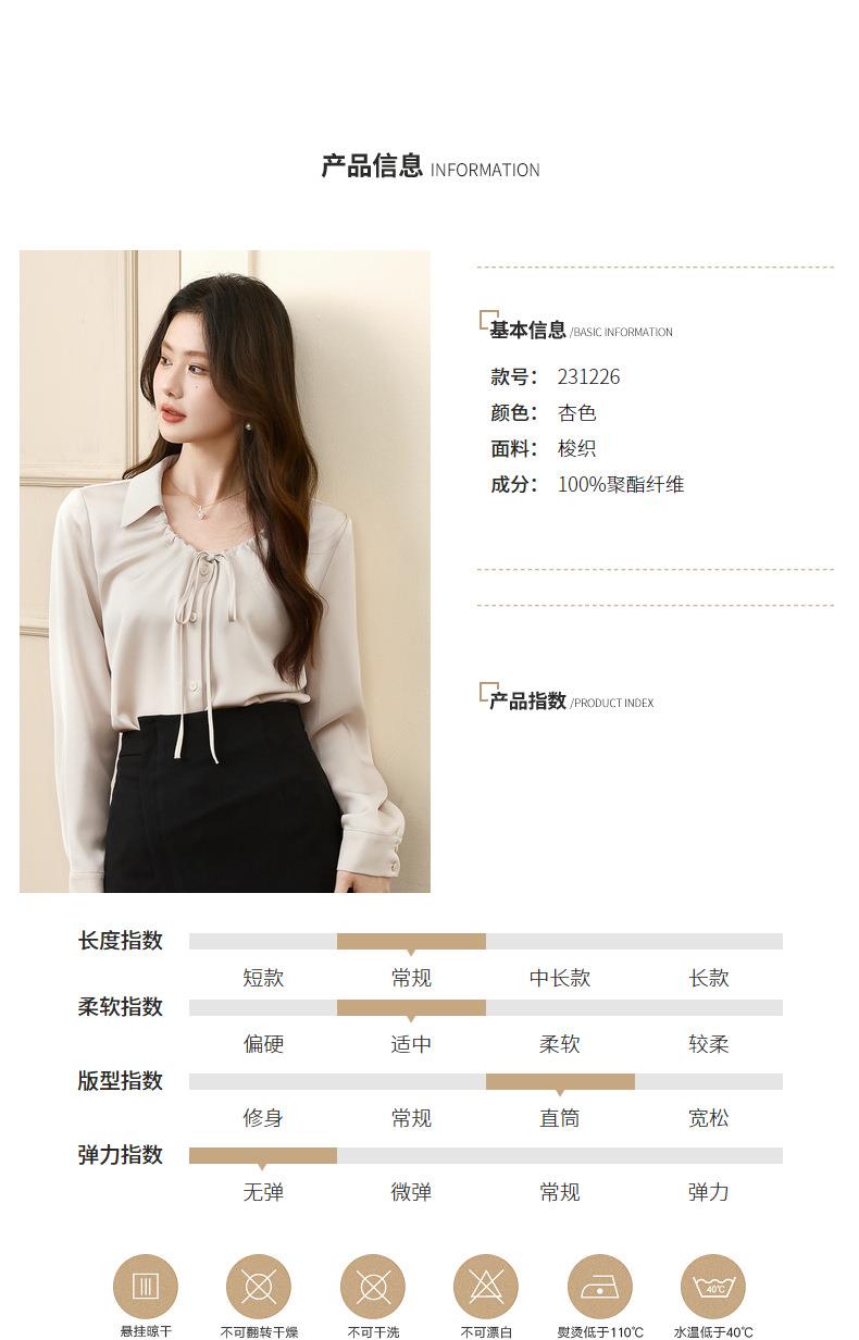 百姿 气质V领抽褶长袖衬衫2023秋季新款小众蝴蝶结雪纺衫女231226