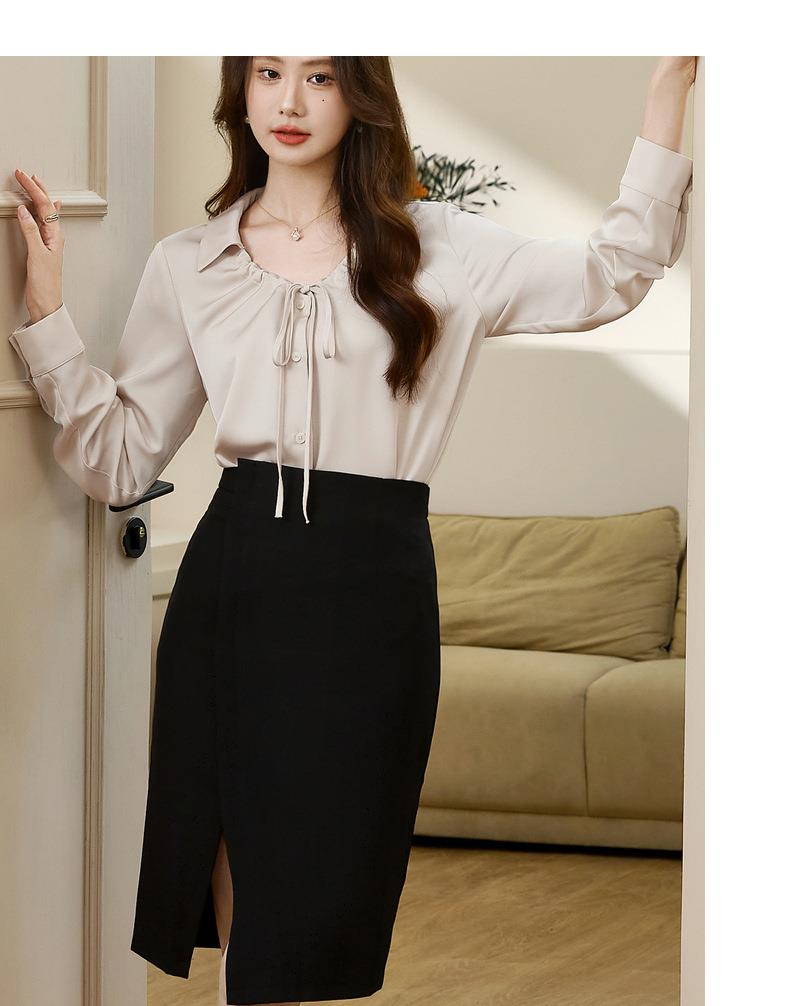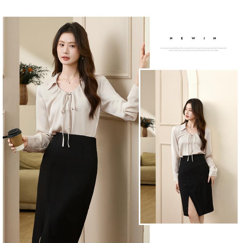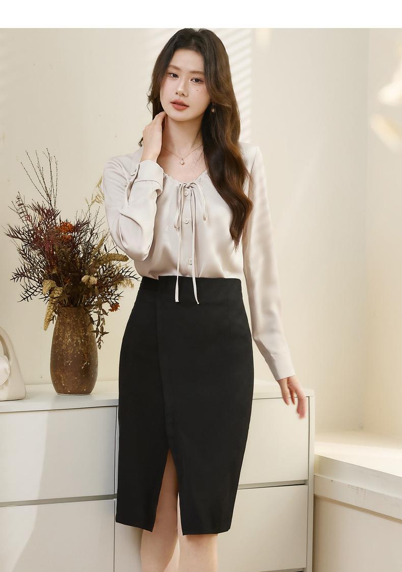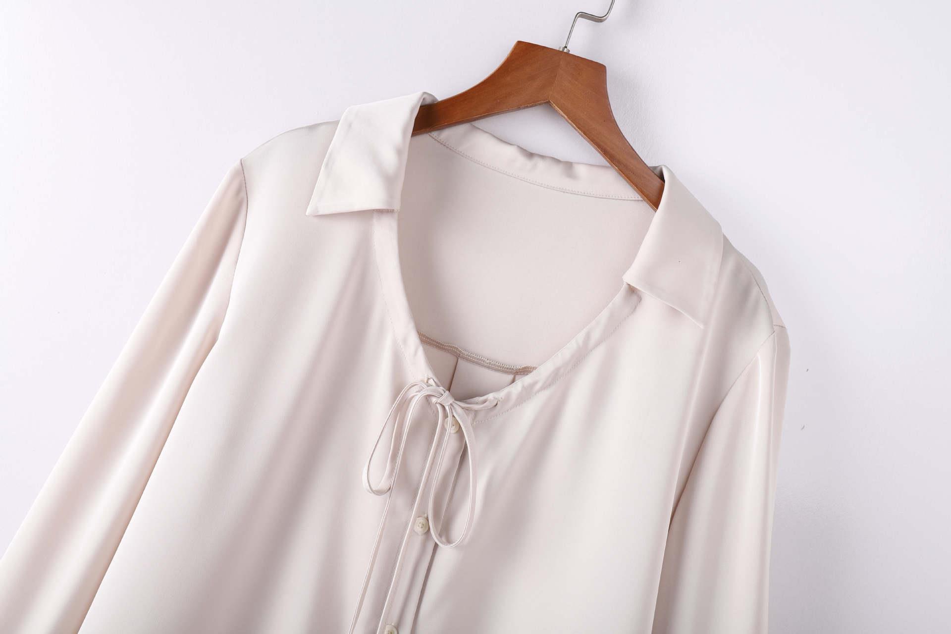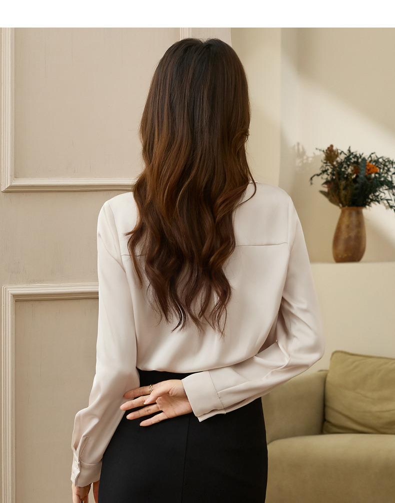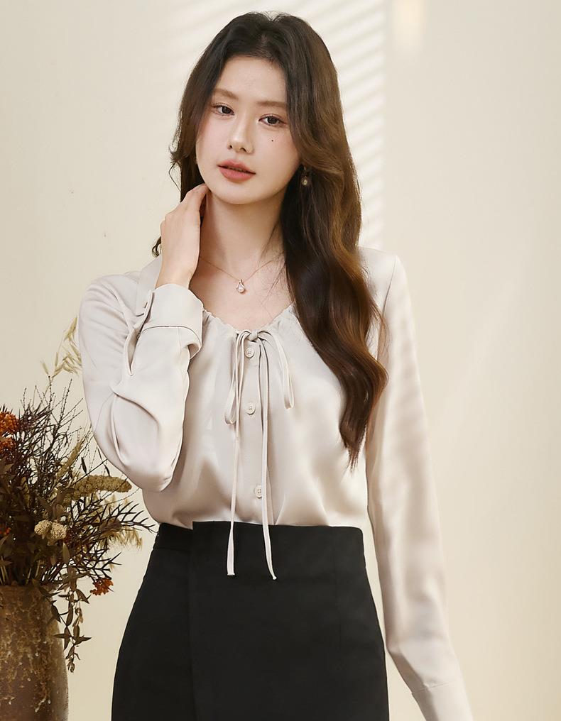 百姿 气质V领抽褶长袖衬衫2023秋季新款小众蝴蝶结雪纺衫女231226