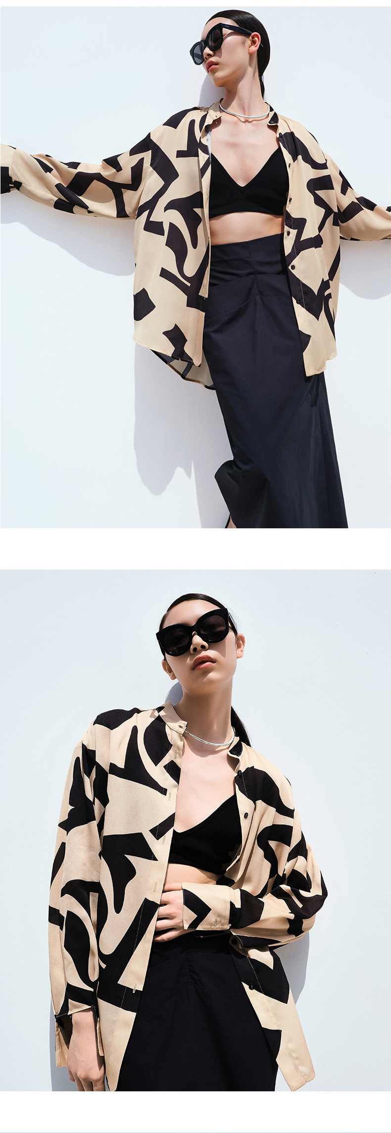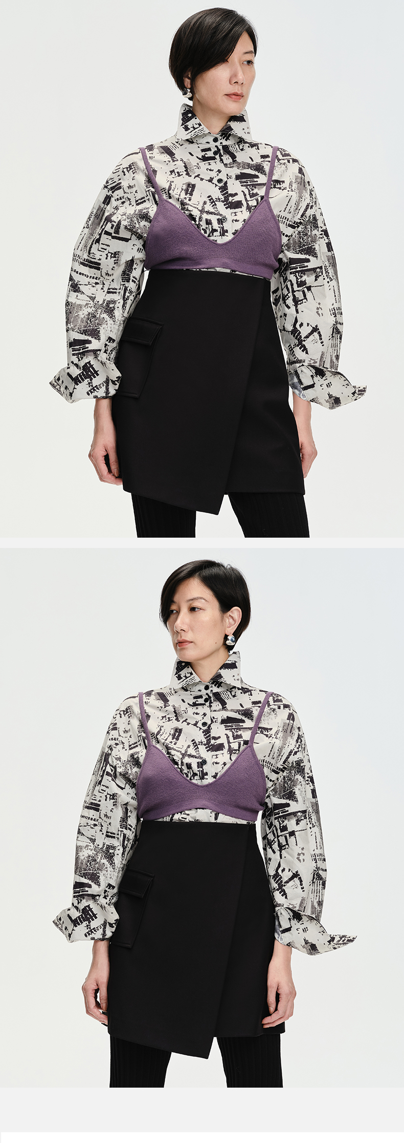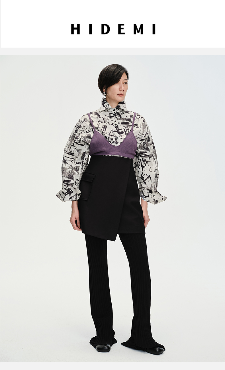 HIDEMI 简约设计感微荡立领半袖廓形套装 黑色/白色 上衣/半身裙