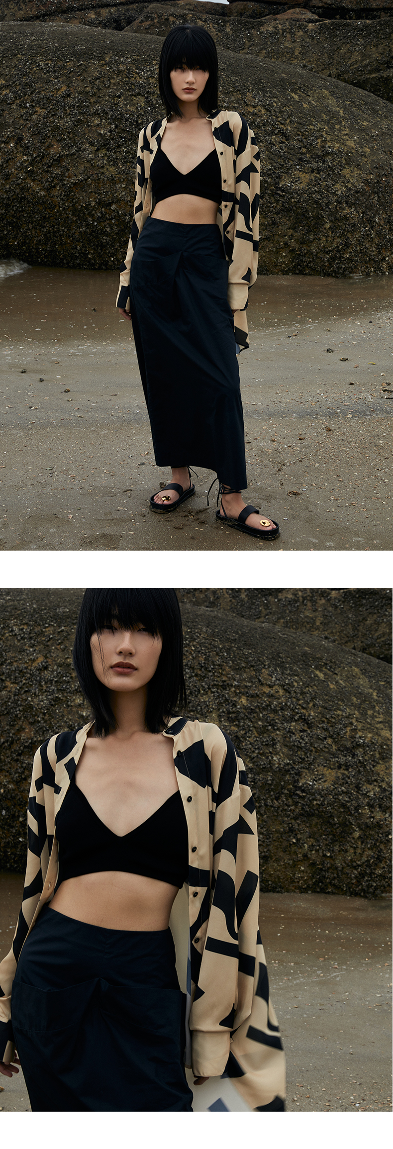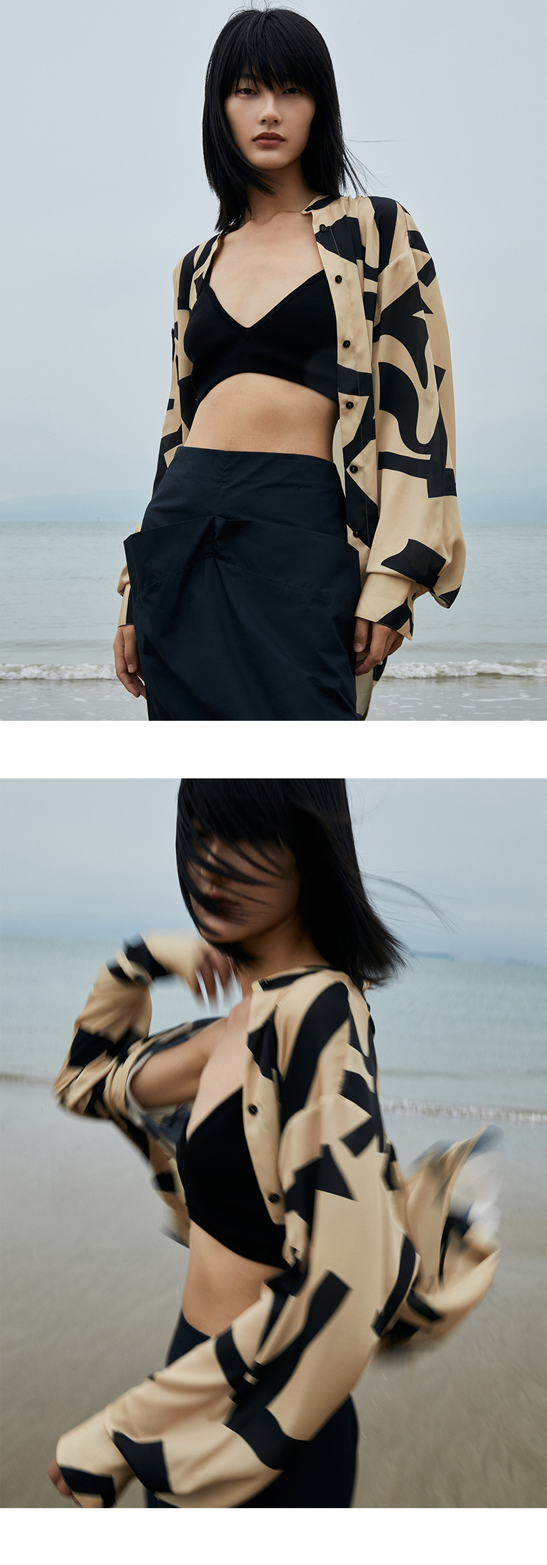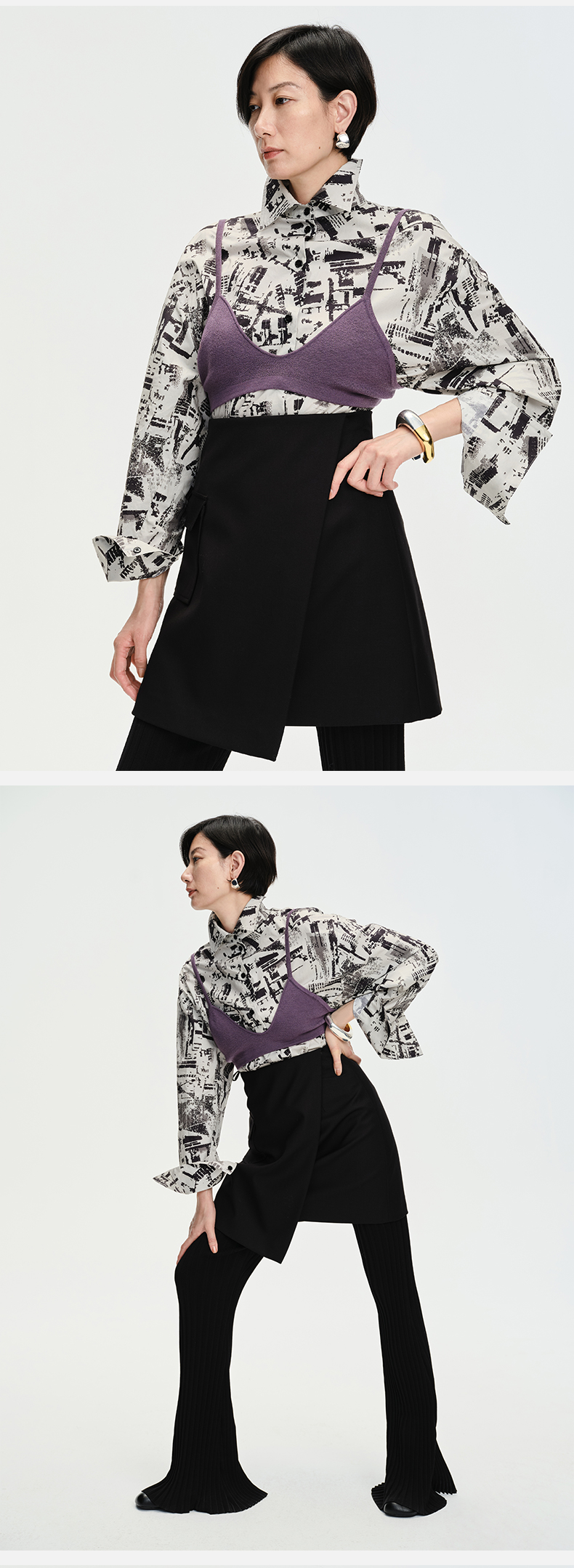 HIDEMI 简约设计感微荡立领半袖廓形套装 黑色/白色 上衣/半身裙