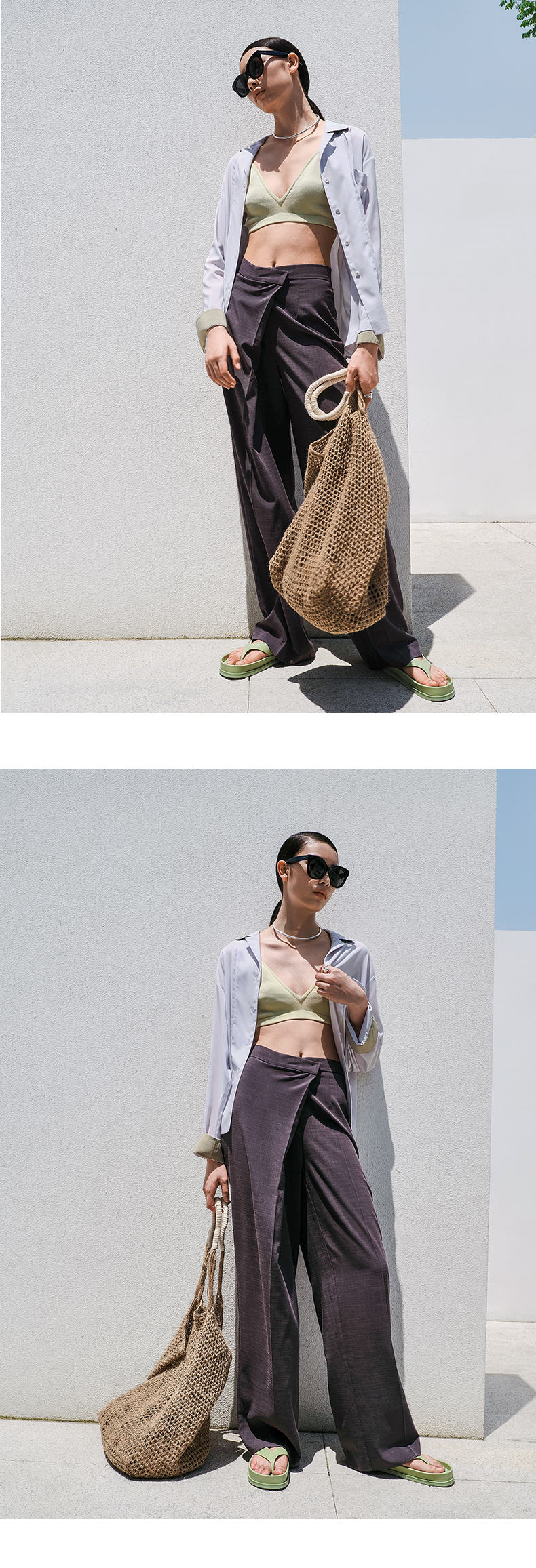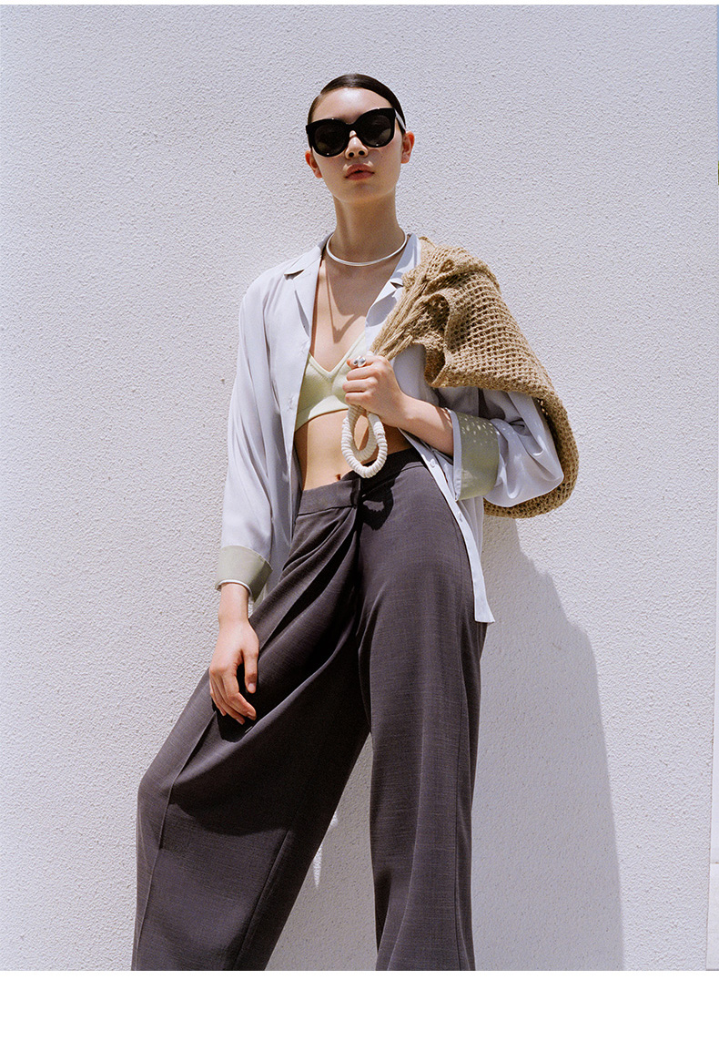 HIDEMI 懒人必备/奶昔白肌理感亚麻套装 圆领衬衫/垂直感侧开衩长裤