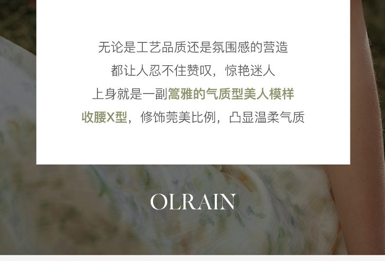 - “精致”是欧芮儿olrain品牌文化的核心,欧芮儿认为,精致的女人,不但要外在动人,更要内在迷人,内外兼修,有魅力、有气质、有内涵,自信而不自傲,优雅而不矫揉,自有万种风情而不轻浮,更不故作矜持。