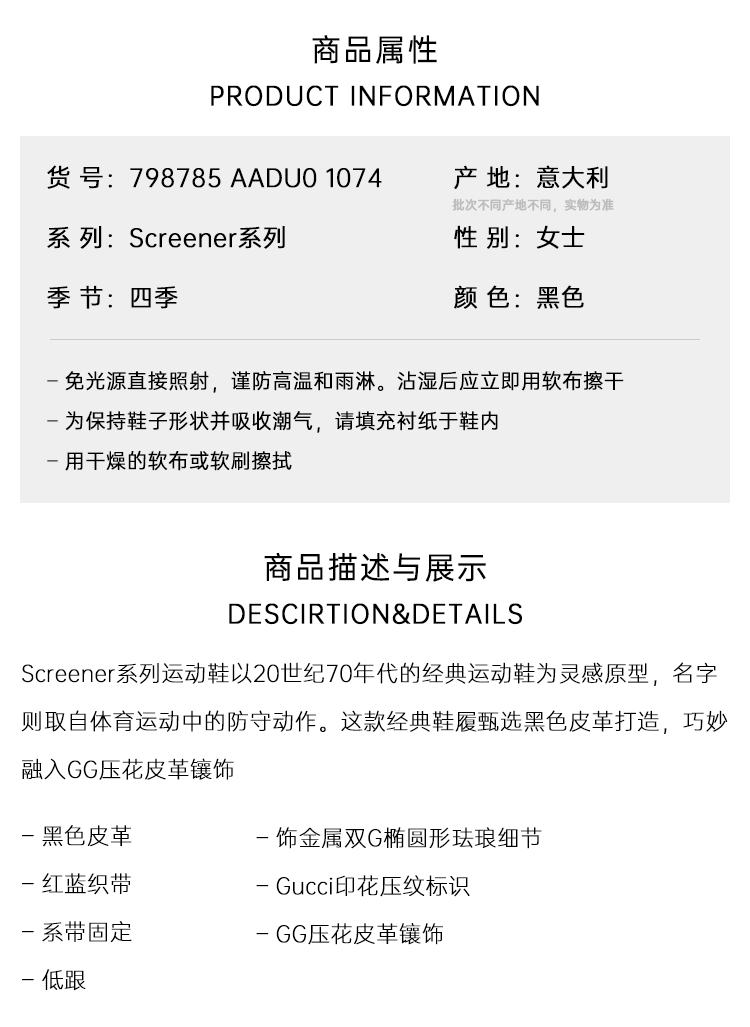 【一】GUCCI 古驰 男士Screener系列休闲运动鞋 黑色 798785 AADU0 1074