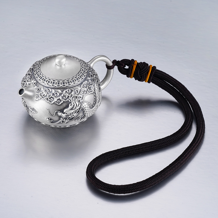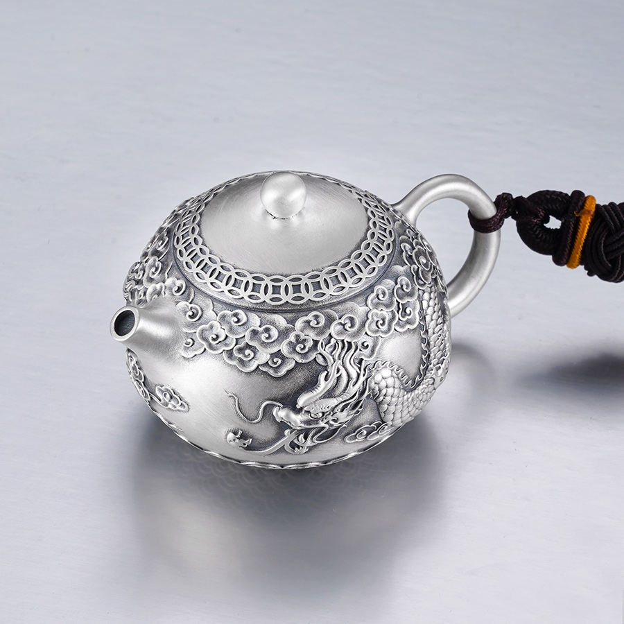 【寓意】:风云起龙骧,壮志展四方。壶形手把件之上,浮雕龙腾祥云之景,寓意持有此款作品之人,遇壶得福,乘时而起,气势非凡。