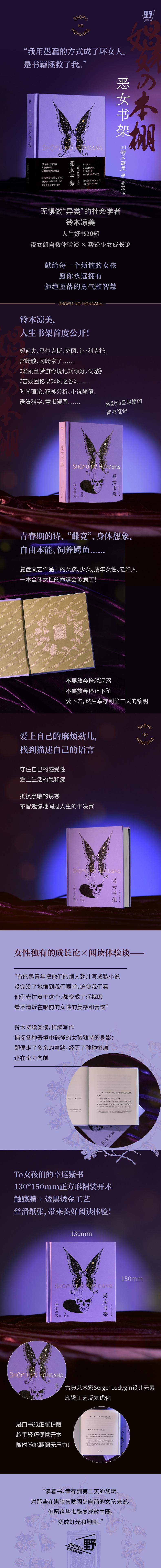 "※ 契诃夫、马尔克斯、萨冈、让·科克托、刘易斯·卡罗尔、宫崎骏、冈崎京子…… 解读大胆犀利,跨越时尚理论、精神分析,到小说随笔、语法科学,乃至童书漫画 铃木凉美,人生书架首度公开! 锐评经典,解构权威,幽默仙品大姐姐的读书笔记! 日本私小说、欧洲青春圣经,记录着青春期的高烧与混乱悸动; 在语法辞典里找无意义的自由,儿童绘本里读出小孩儿的反抗; 夜女郎为更多女孩推荐深深影响她人生的书籍。 ※ “雌竞”、自毁幻想、恋父情结、沉迷牛郎、饲养鳄鱼…… 复盘文艺作品中的女孩、少女、成年女性、老妇人,一本全体女性的命运会诊病历! 从两千年前的古罗马残卷《妓女对话》,到描绘现代日本女性贫困聚集地的《我家》,从电影《狼狈》原作者冈崎京子的《pink》中饲养完全内化消费主义的女孩,百万畅销漫画家的回忆录《静子》中完美而可怖、仇恨女儿的母亲…… 在生活的荒野上前行,如果你不再相信身边的任何人,听到的任何话, 至少不要放弃阅读,不要放弃停止下坠、挣脱泥沼, 读下去,然后幸存到第二天的黎明。 ※ 爱上自己的麻烦劲儿,找到描述自己的语言, 守住自己的感受性,接受世界的愚和痴,用一颗心来感受时间—— 蜚声世界的经典绘本《毛毛》,到宫崎骏的《风之谷》; 从井上厦的《私家版 日语语法》到欧洲迷茫少年的“代言语录”《劈叉》; 允许犯错、允许时间被虚度,允许弄脏自己的双手,但不要做危险的事; 已经度过四十岁之年的恶女斗士,希望你抵抗黑暗的诱惑,不留遗憾地闯过人生的半决赛; 既可以像娜乌西卡一样高洁地飞翔,也能勇敢地亲吻泥污的大地。 ※ 130*150mm正方形精装开本,触感膜 + 烫黑烫金封面工艺,内文开纸丝滑,带来美好阅读体验! 诚意选色,灵动布局、精选古典艺术家Sergey Lodygin元素设计,配合阅读带来澎湃的情感共鸣! 封面选纸历经多次调试,印烫工艺反复优化,高清显色,质感丰富; 内文选用进口书纸,顺纹开纸,触感温润,细腻护眼,趁手轻巧便携开本,随时随地翻阅无压力。"
