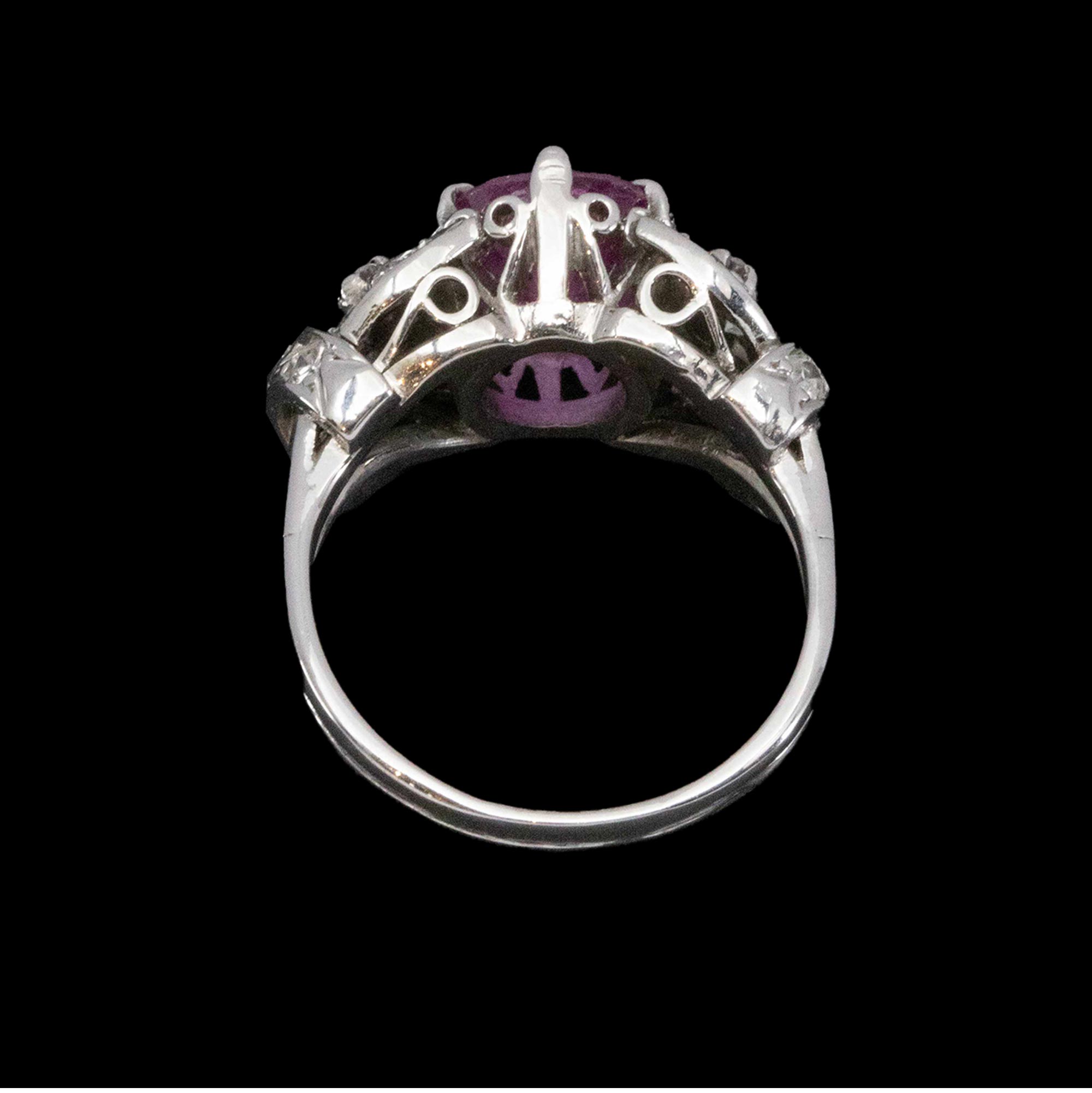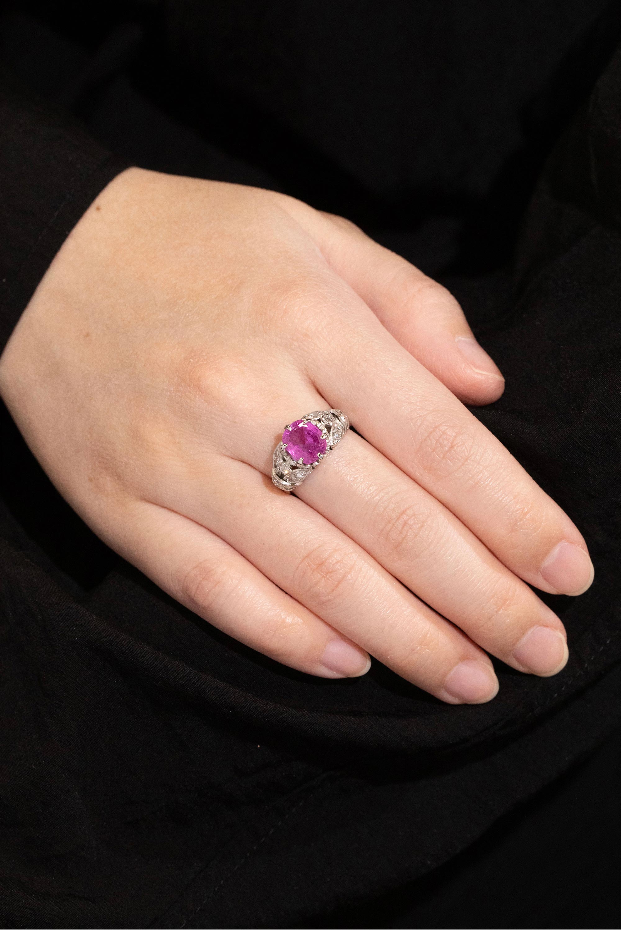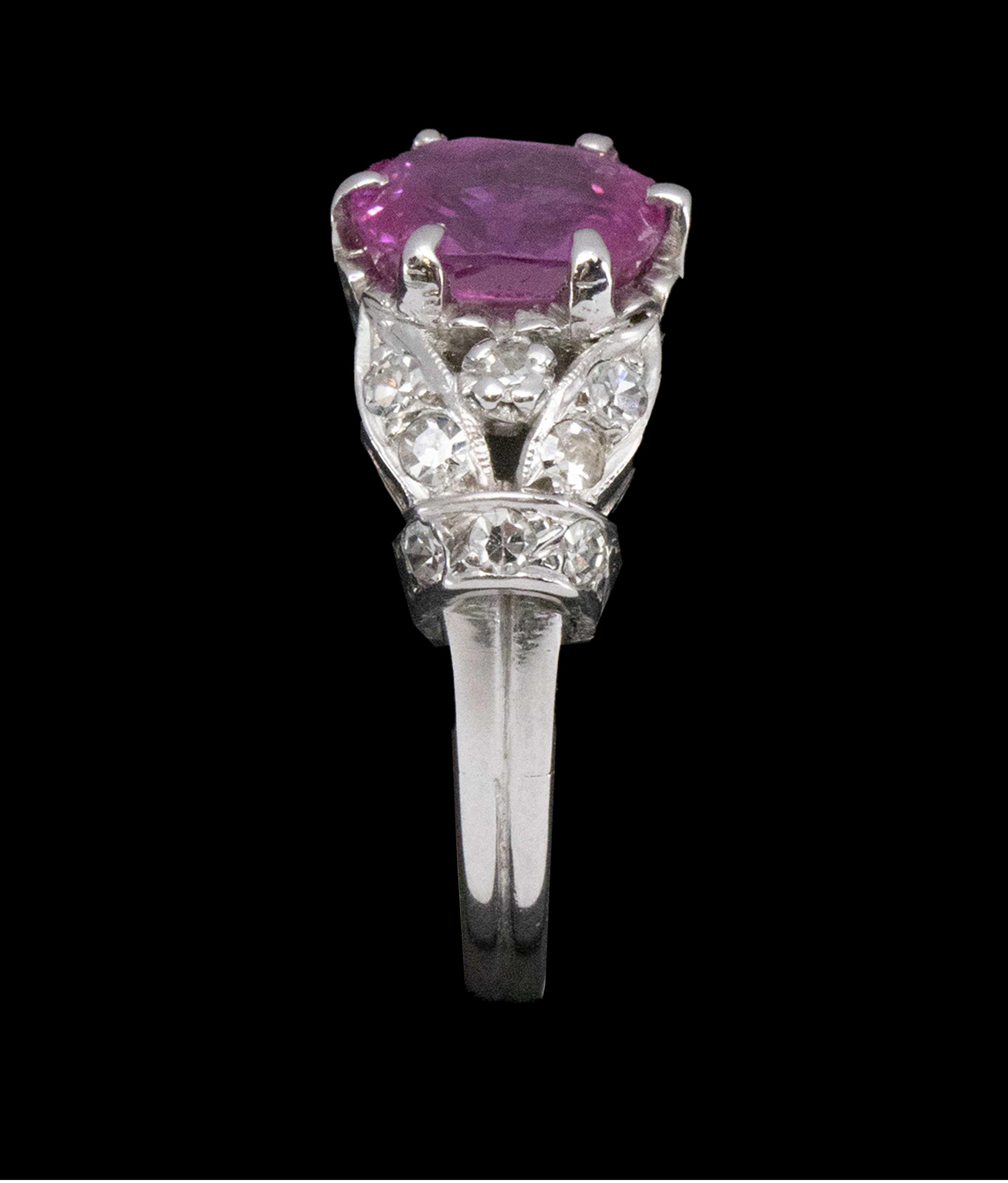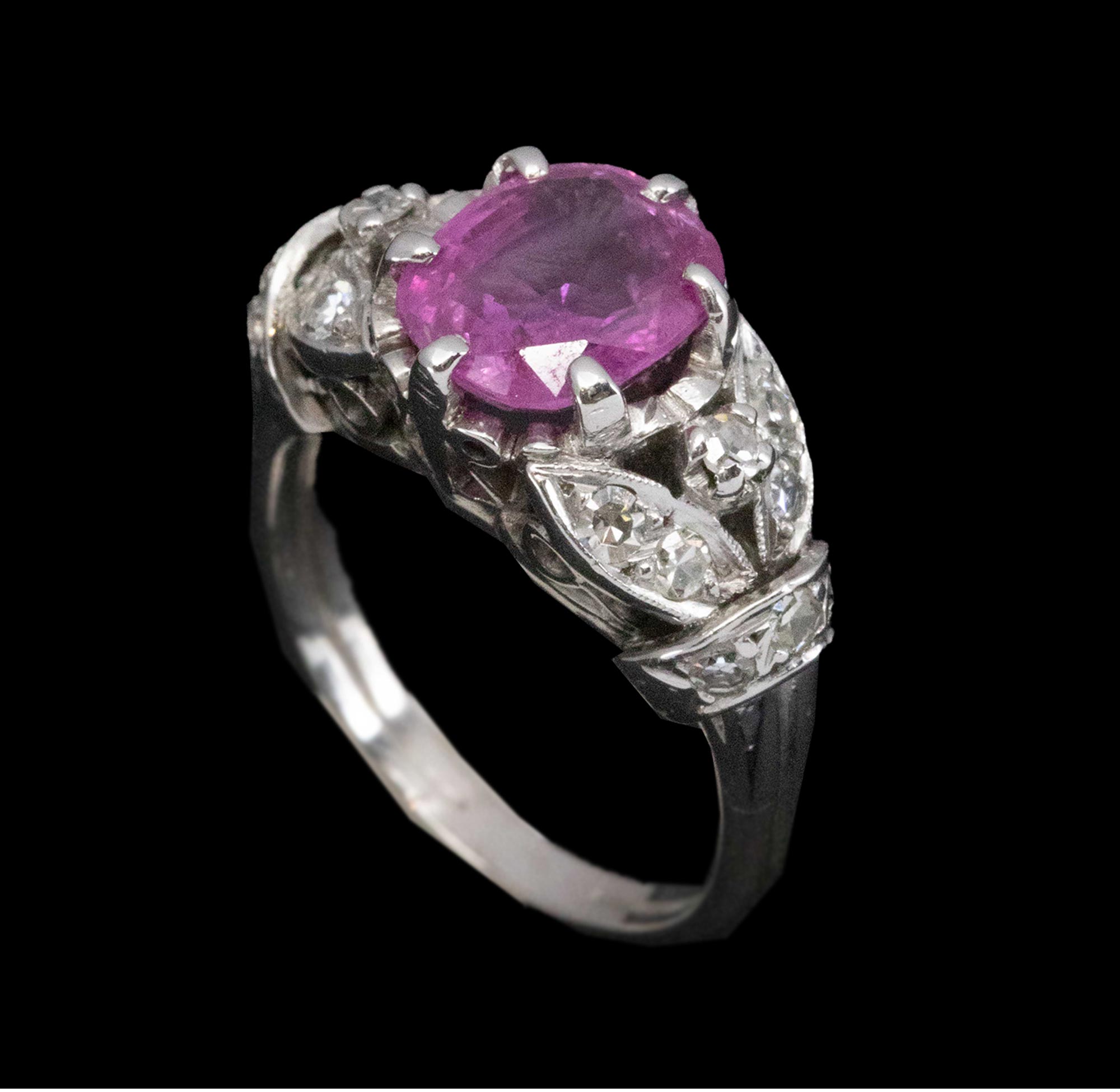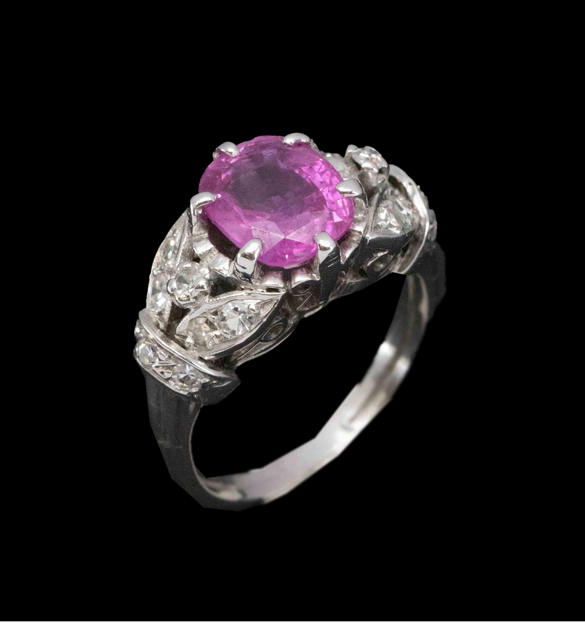 1930年代法国出品叶纹造型白金镶嵌钻石及粉色蓝宝石戒指