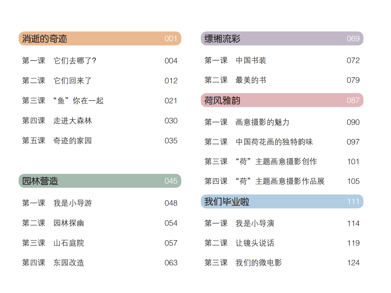 "消逝的奇迹"通过学科融合,以美术方式完成灭绝物种的场景再现;"园林营造",以园林改造的虚拟任务引领环境艺术设计与制作;"缥缃流彩"",从最美的书角度探究书籍设计;"荷风雅韵",以画意摄影探究如何融合传统文化与影像技术;"我们毕业了",是契合新课标的微电影单元课。