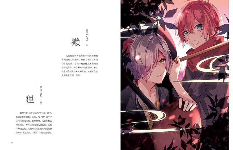 本书用插画的形式将自古以来的妖怪以美丽的少年形象展现给大家,从鸟山石燕《画图百鬼夜行》《今昔画图续百鬼》《今昔百鬼拾遗》《百器徒然袋》中精选了30个妖怪,委托28位画师进行创作。