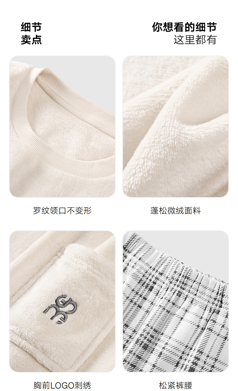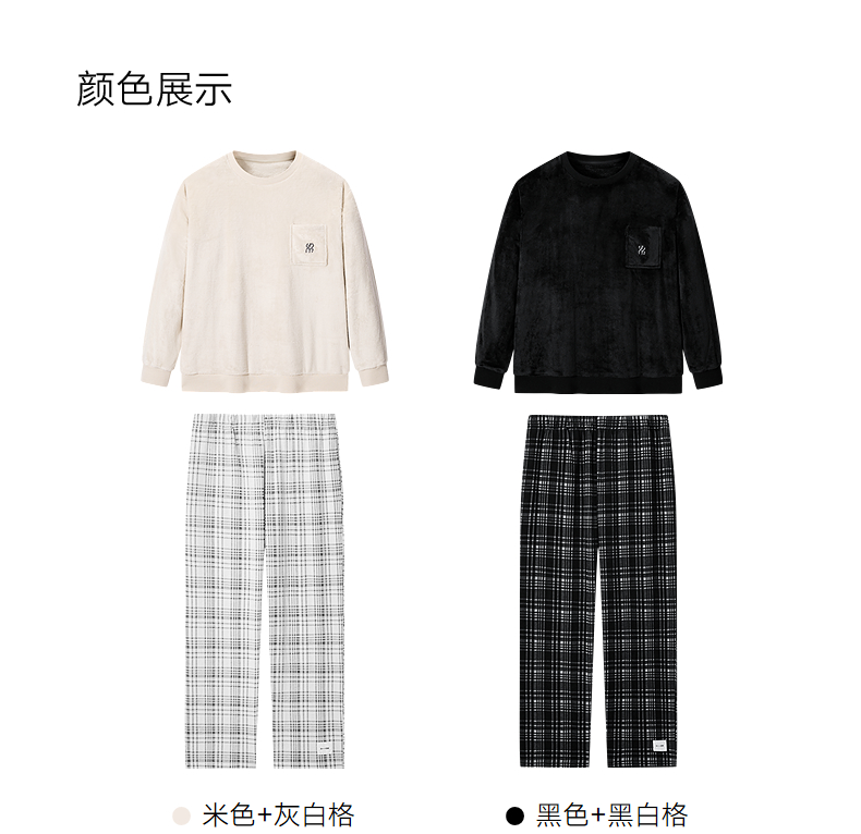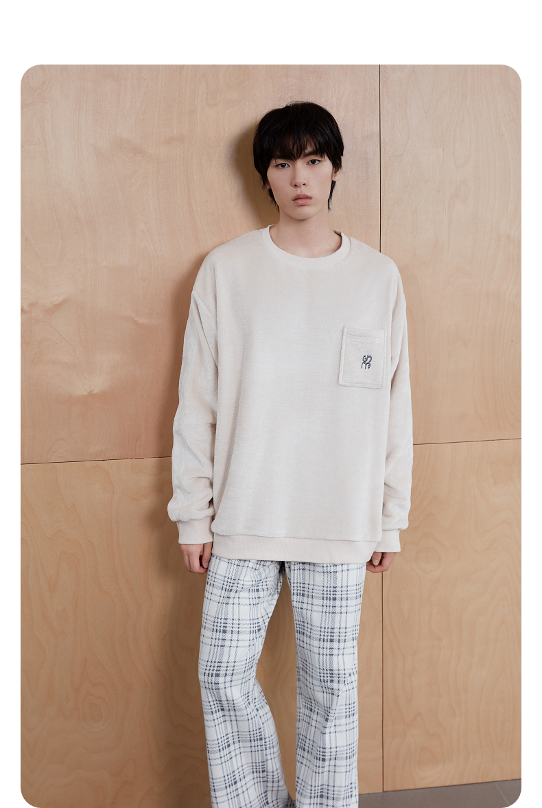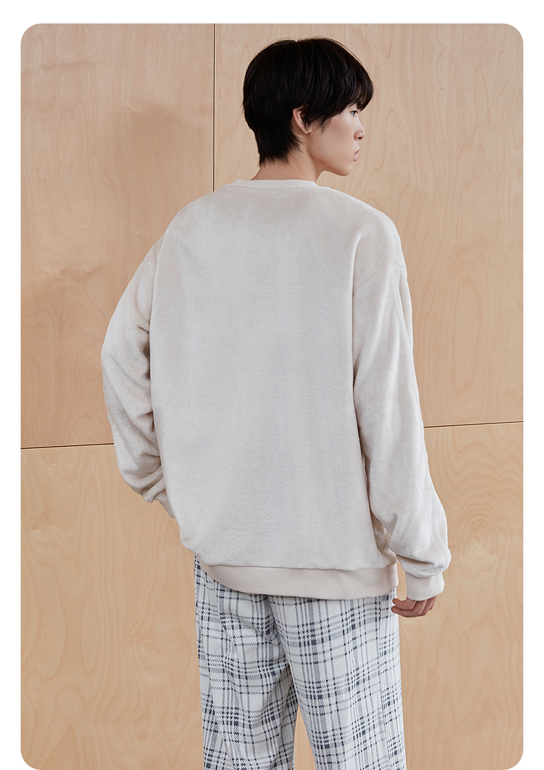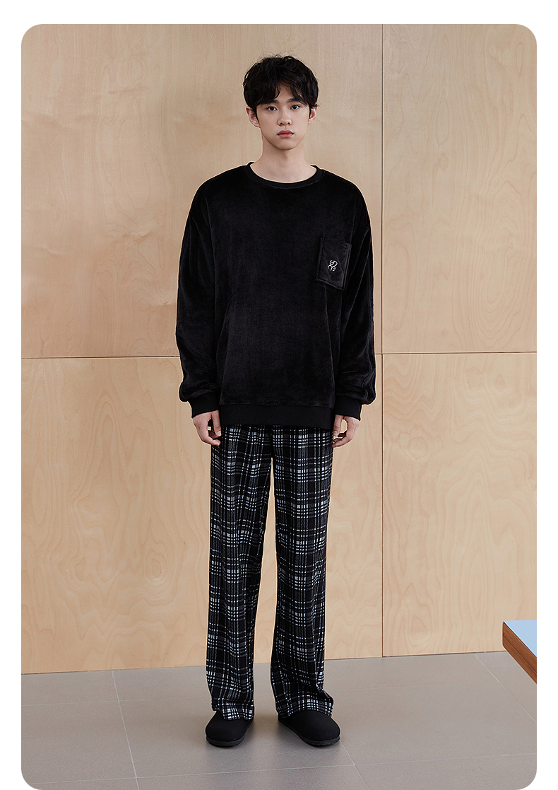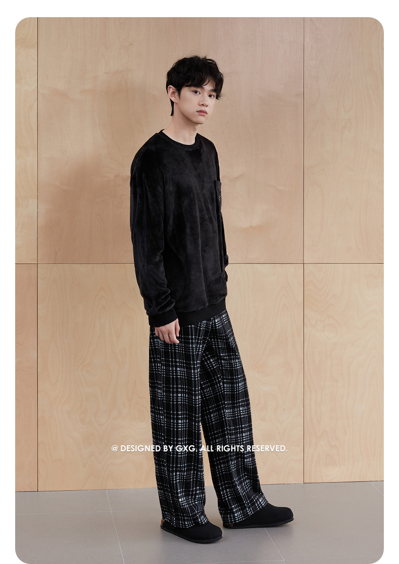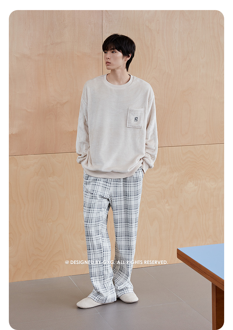 GXG男士家居服 蓬松微绒肌理感长袖套头睡衣格子睡裤廓形睡衣套装