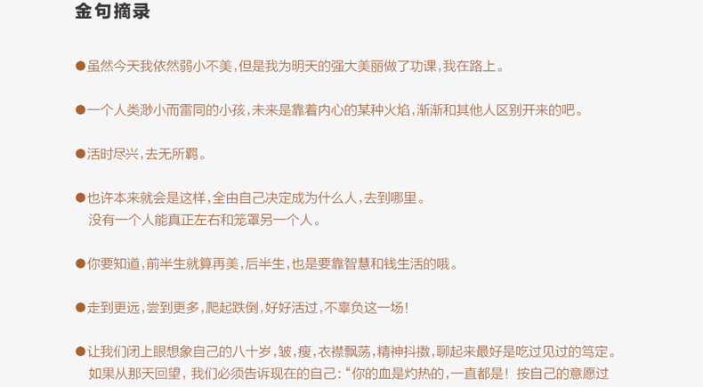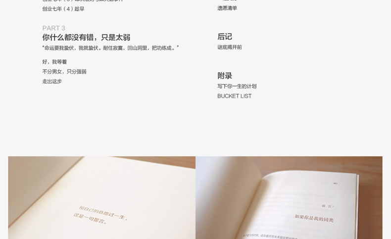 特别收录《一生的计划》及《遗愿清单》,全书内文专金双色印刷。从今天开始,亲笔写下自己的人生梦想,在这个野心时代活出真正的自己!