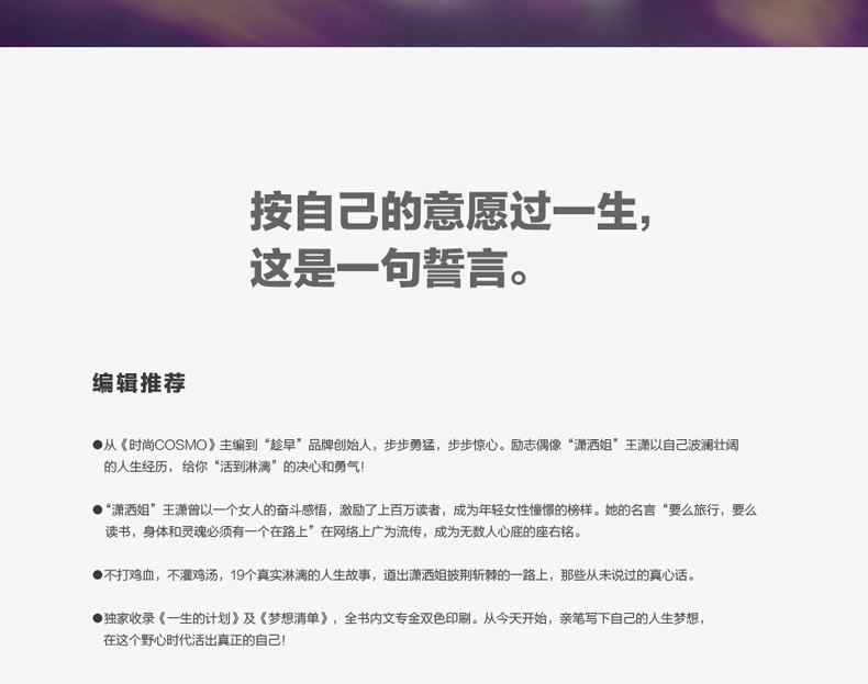励志偶像“潇洒姐”王潇推出全新力作《按自己的意愿过一生》,继《女人明白要趁早》后,首度披露在成长、创业、情感历程中的笑与泪。