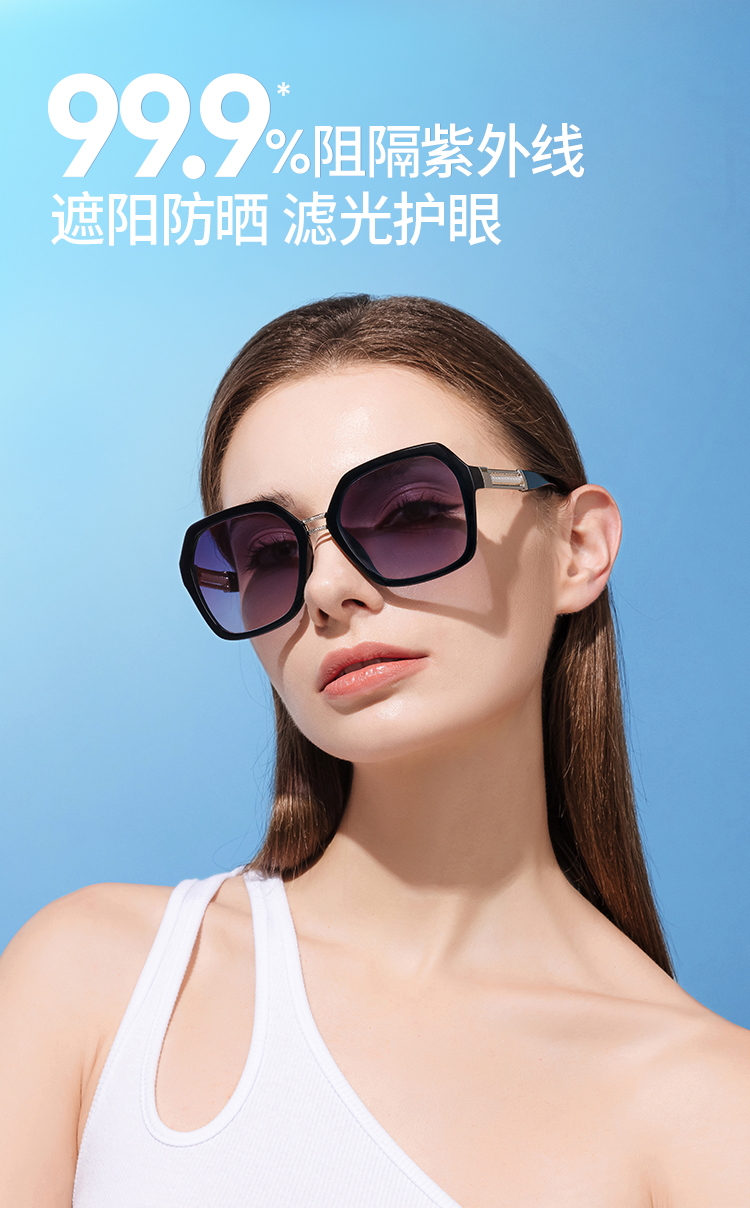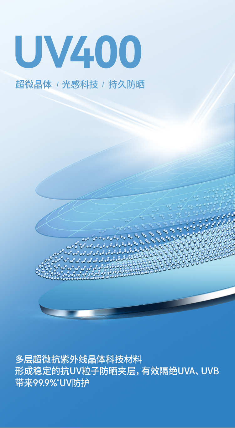 不仅外观时尚,防晒力也强,采用多层超微抗紫外线晶体科技材料,形成稳定的抗UV粒子防晒夹层,有效隔绝UVA、UVB带来99.9%*UV防护,升级高清偏光镜片,遮阳更有效,视觉更清晰。