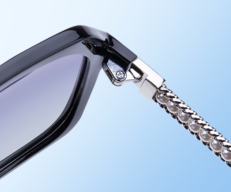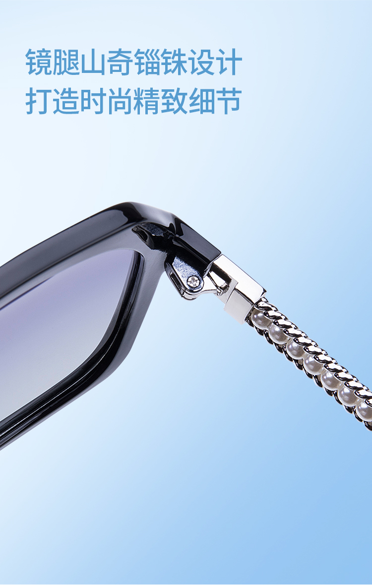 它的外观设计有一个小巧思,就是它的镜腿上有珍珠进行了设计,比普通墨镜更显精致,时尚感十足。