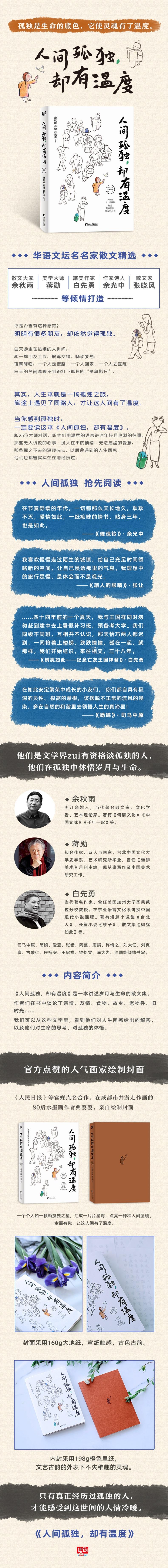 ·一本安抚人心的读本:只有真正经历过孤独的人,才能真切感受到这世间的人情冷暖。本书策划初衷就是想用文字安抚当下孤独的每一位青年。 ·华语名家选篇:本书收录了余秋雨、蒋勋、白先勇、余光中、简媜、张晓风等知名作家的散文作品,是一本讲述岁月与生命的散文集。 ·了解名家对人生和孤独的体会:那些你正在经历的、以后会遇到的人生困惑,本书的作者们也都曾实实在在地经历过。他们将自己的人生智慧倾囊而谈,毫无保留地告知读者。 ·内容丰富有趣:作者在书中谈论了亲情、友情、食物、故乡、老物件、旧时光……你可以从这些文字里,看到他们对人生困惑给出的解答,以及他们对生命的思考、对孤独的体悟。