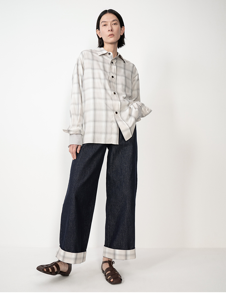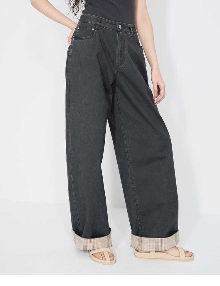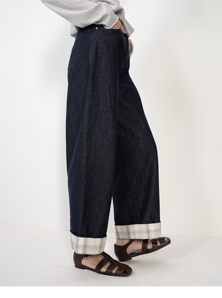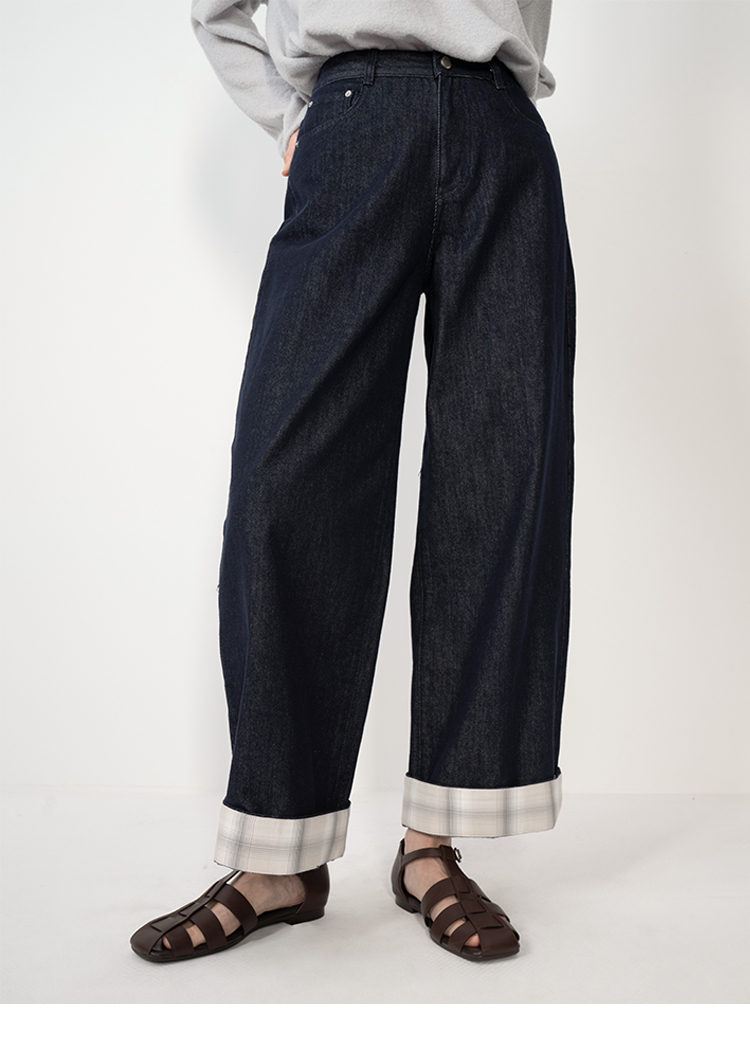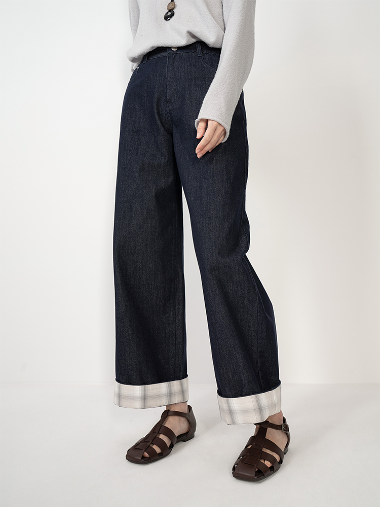 HIDEMI 复古牛仔蓝阔腿格纹拼接卷边牛仔裤
