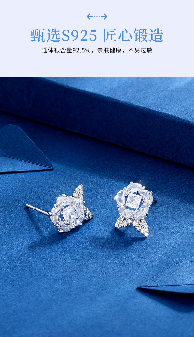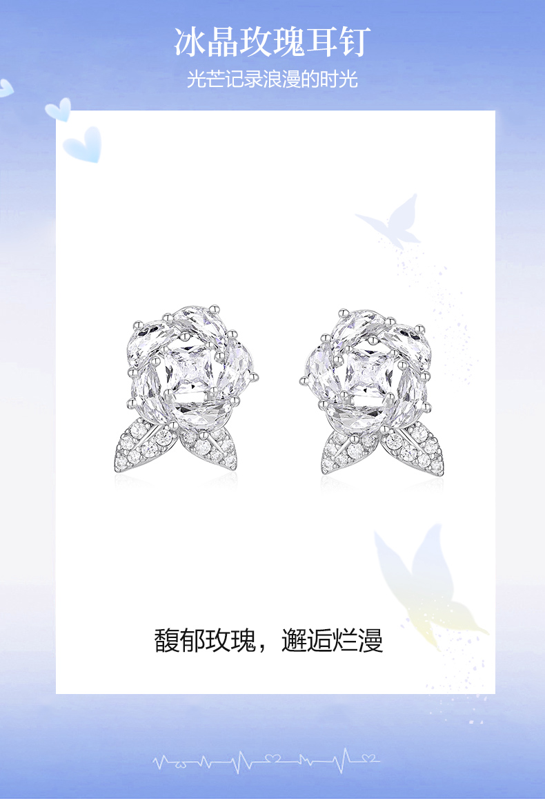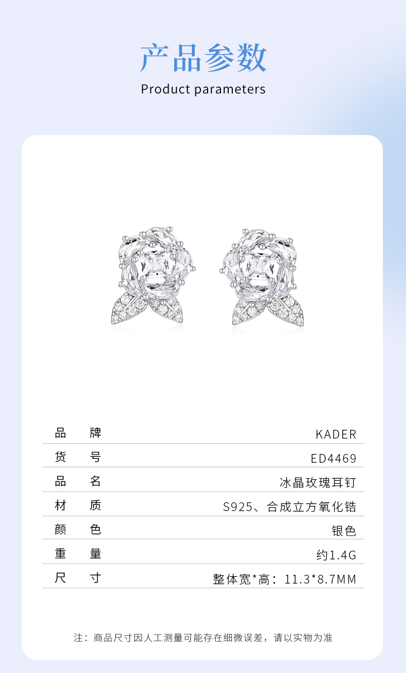 卡蒂罗/KADER 冰晶玫瑰耳钉 精致轻奢满镶钻石优雅浪漫甜蜜璀璨闪耀纯银耳饰 温柔气质养耳洞配饰