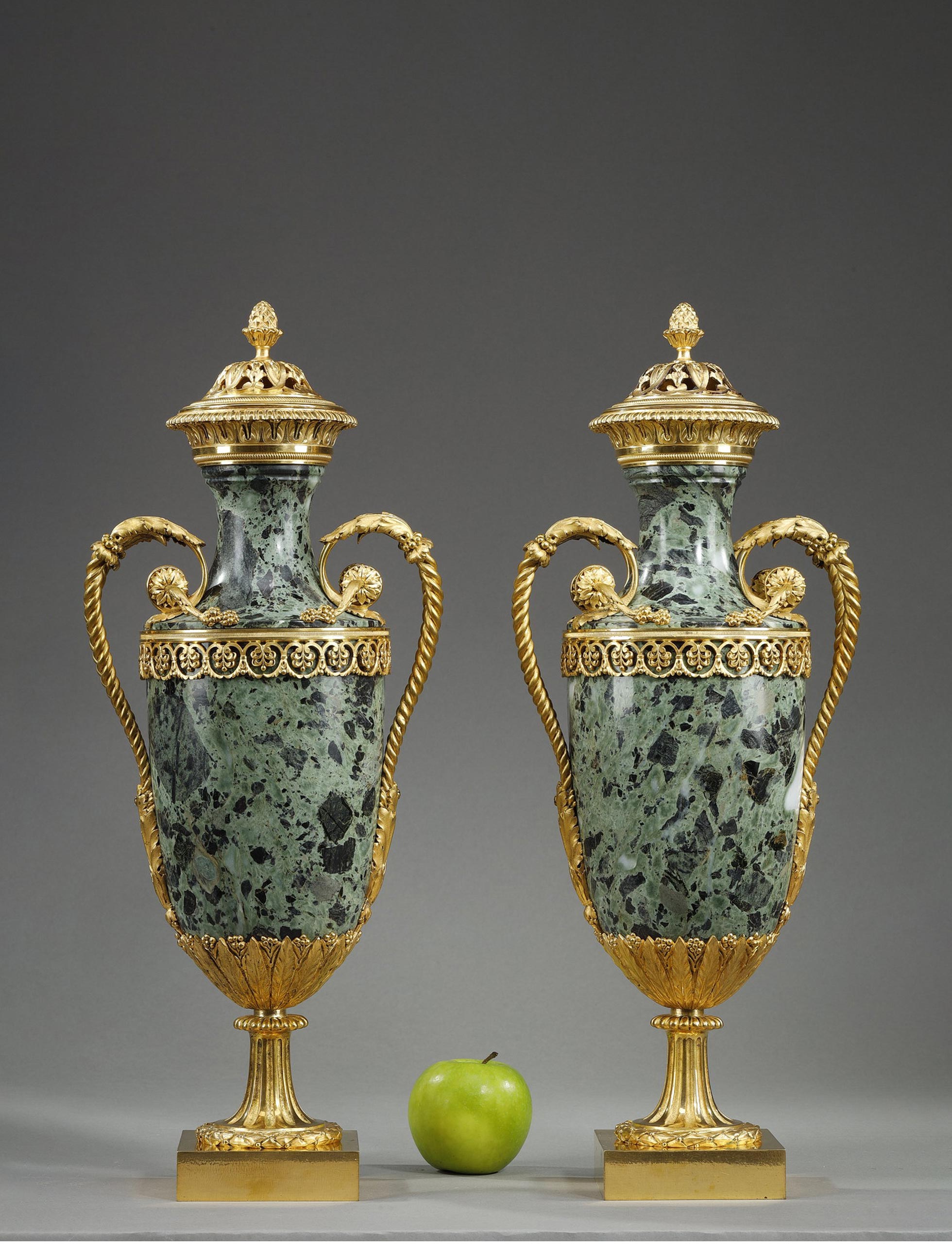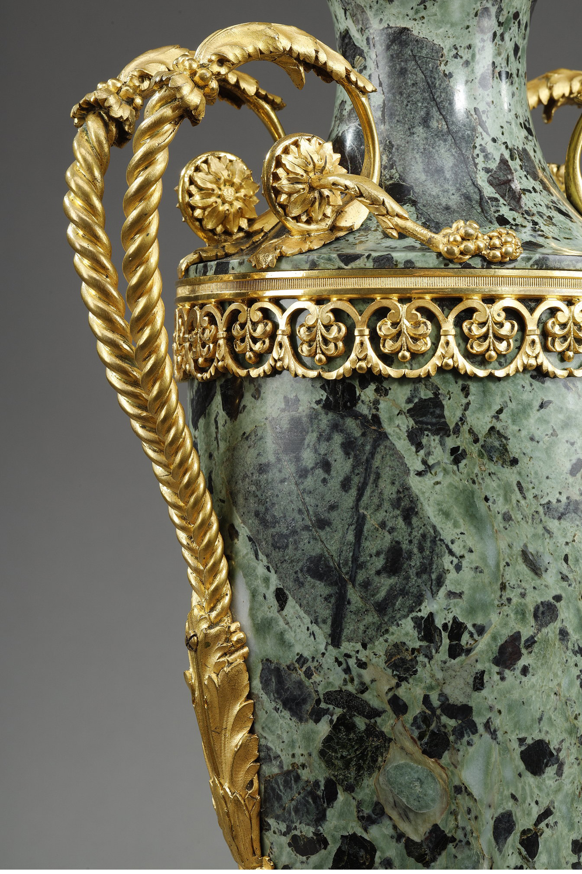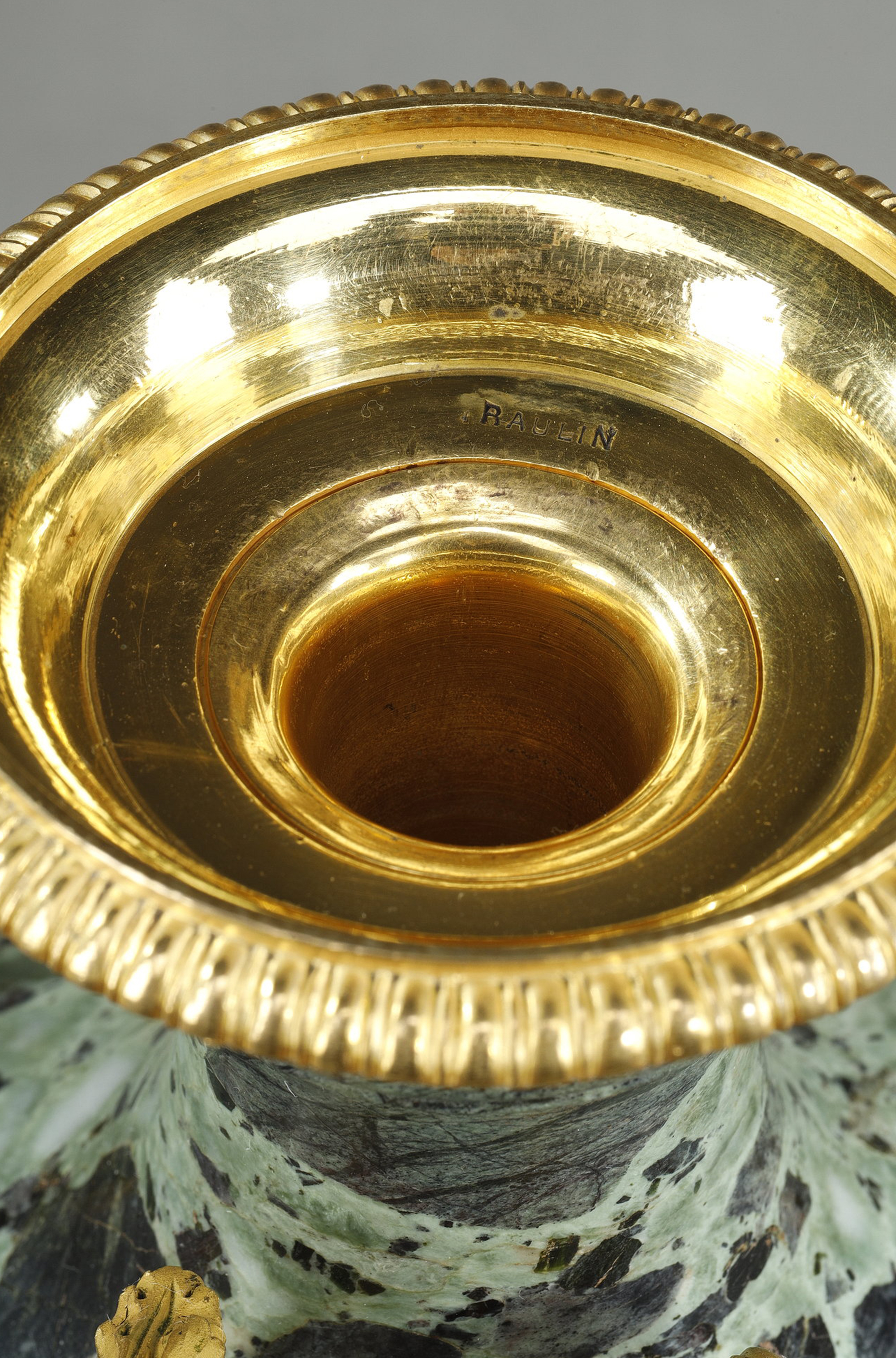 19世纪法国名坊RAULIN签名出品松果叶纹主题铜鎏金精雕装饰绿色大理石双耳带盖花瓶一对