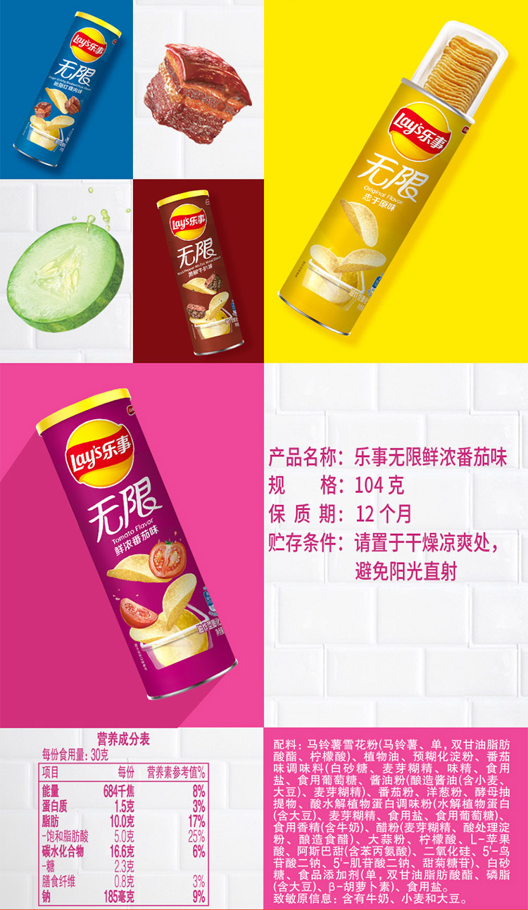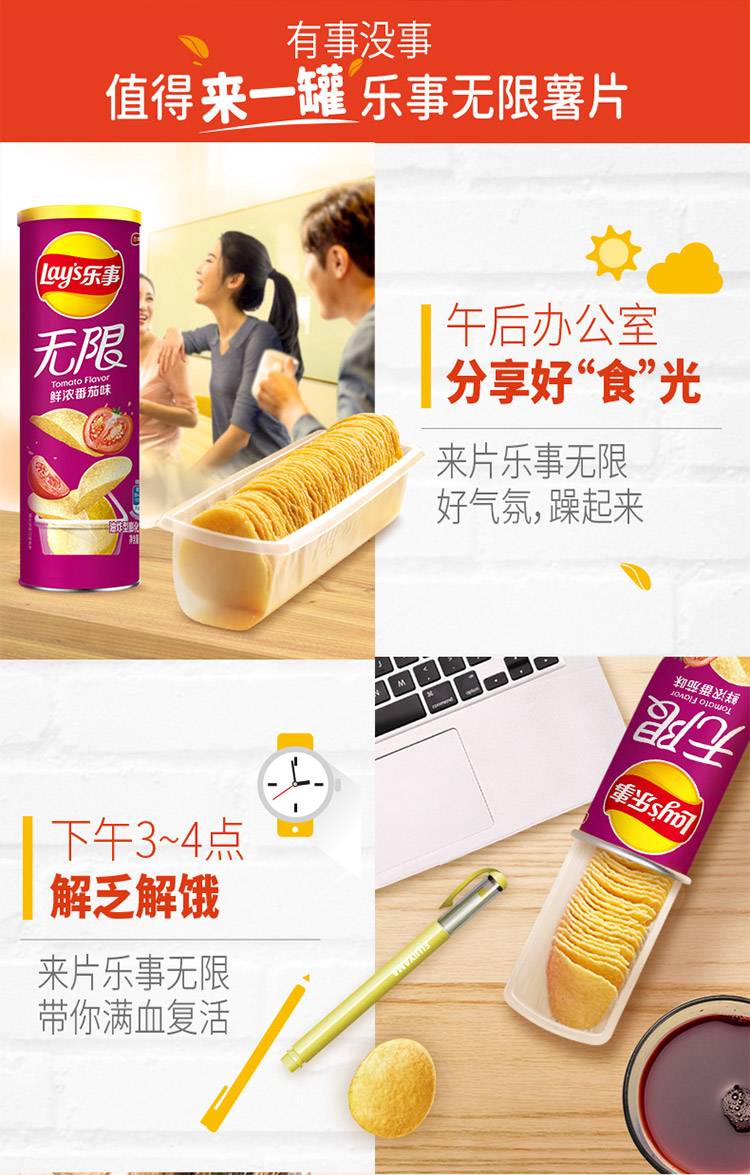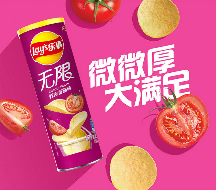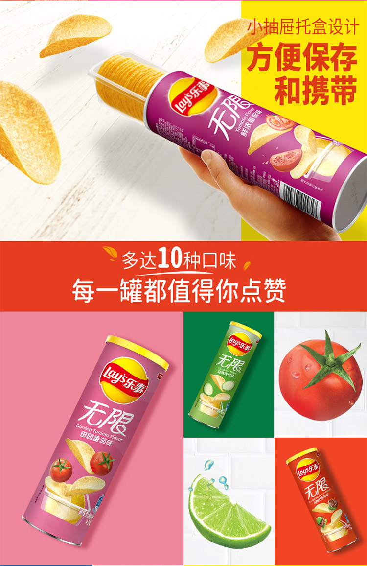 乐事Lay’s无限薯片 零食 休闲食品 鲜浓番茄味104g罐装 膨化食品