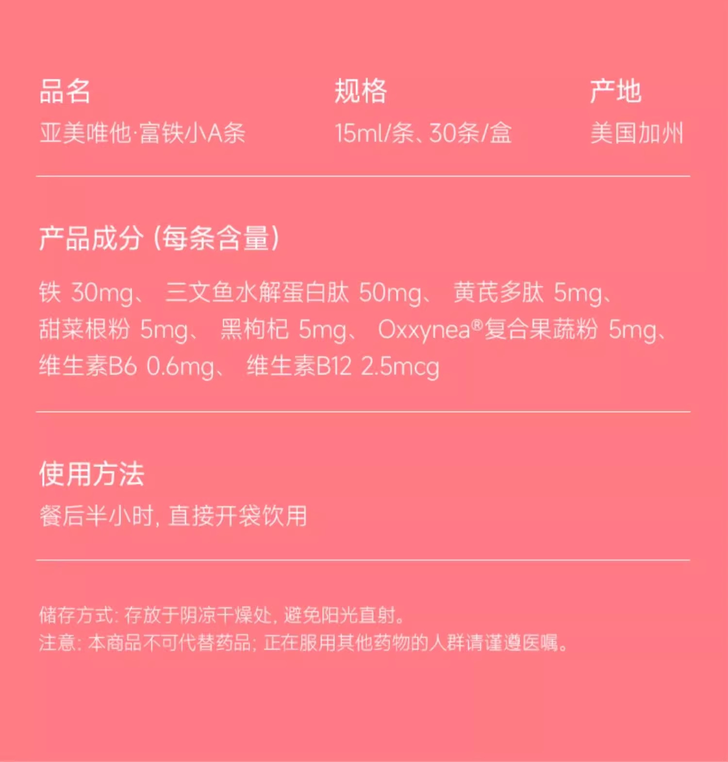 [ Ameri-Vita] 亚美唯他富铁口服液孕妇贫血女性经期便携铁剂铁元素口服液富铁小A条