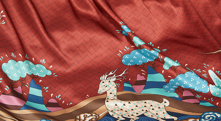 灵感源自敦煌莫高窟北魏257窟壁画,该壁画以长卷式连环画展现了《鹿王本生》的故事。故事中九色鹿是真善美的化身,具有非凡的象征意义,象征着爱、勇气和智慧。丝巾以九色鹿配以青绿山水,并点缀寓意吉祥的花卉、忍冬等纹样,表达美好及福禄之意。![]() |