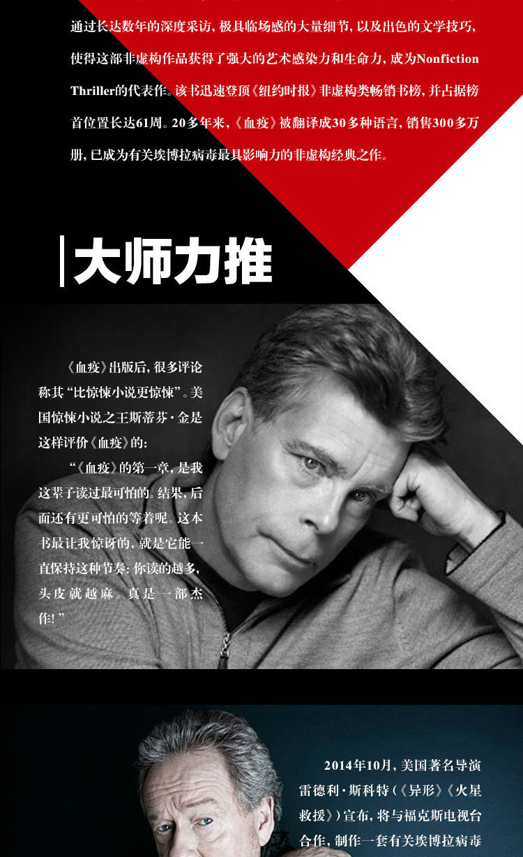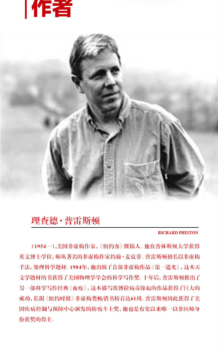 | 理查德•普雷斯顿(RICHARD PRESTON,1954— ),美国非虚构作家,《纽约客》撰稿人。他在普林斯顿大学获得了英文博士学位,师从ZhuMing的非虚构作家约翰•麦克菲。普雷斯顿擅长以非虚构手法,处理科学题材。1984年,他出版了首部非虚构作品《DiYi道光》,这本天文学题材的书获得了美国物理学学会的科学写作奖。十年后,普雷斯顿推出了另一部科学写作经典《血疫》,这本描写埃博拉病毒缘起的作品获得了巨大的成功,长踞《纽约时报》非虚构类畅销书榜首达61周。普雷斯顿因此获得了美国疾病控制与预防中心颁发的防疫斗士奖,他也是有史以来WeiYi以非医师身份获奖的得主。 |