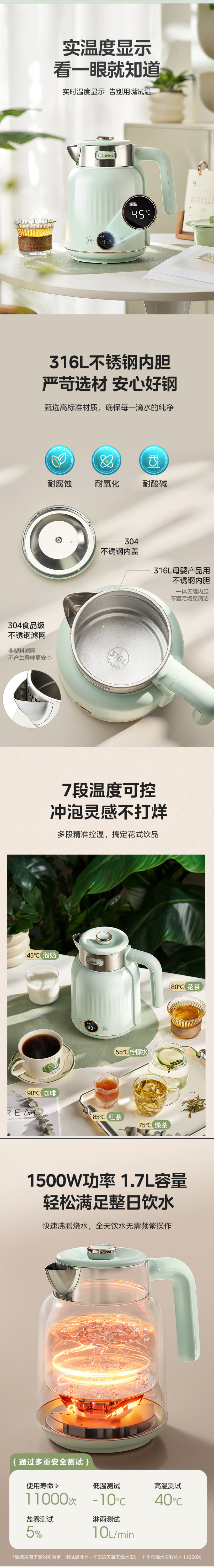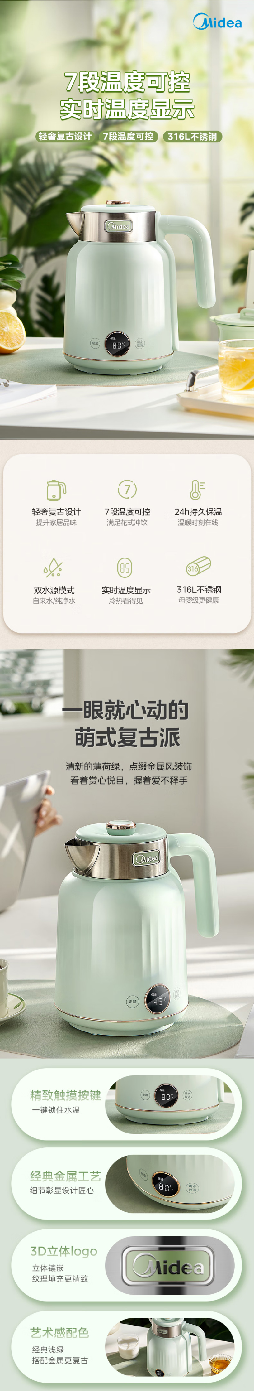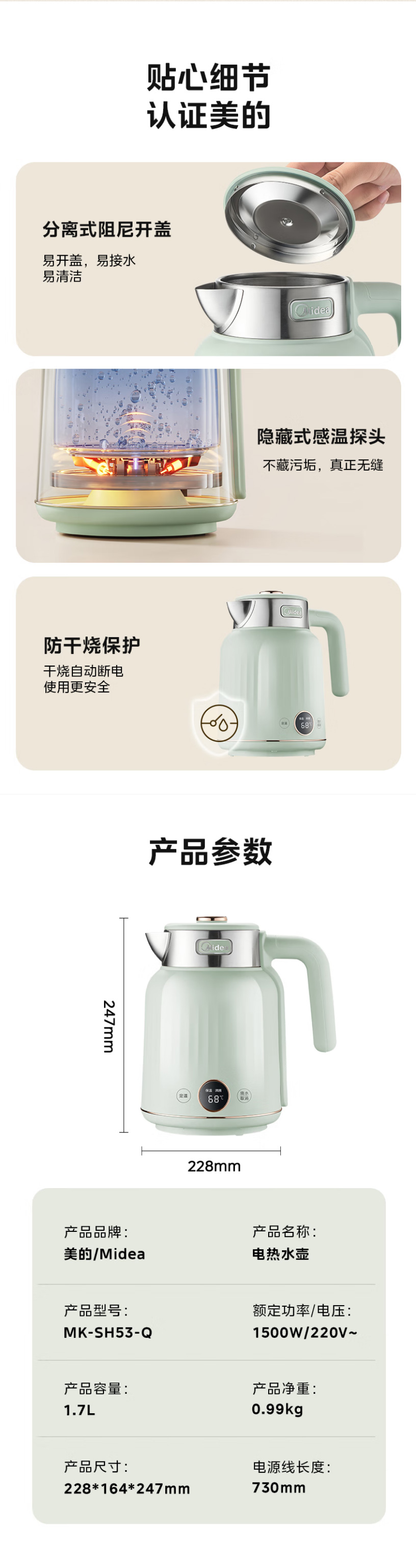 美的(Midea)(510620)电水壶烧水壶自动断电保温一体 国补 1.7L大容量无缝电热水壶 316L不锈钢恒温壶 7档温控 53-Q