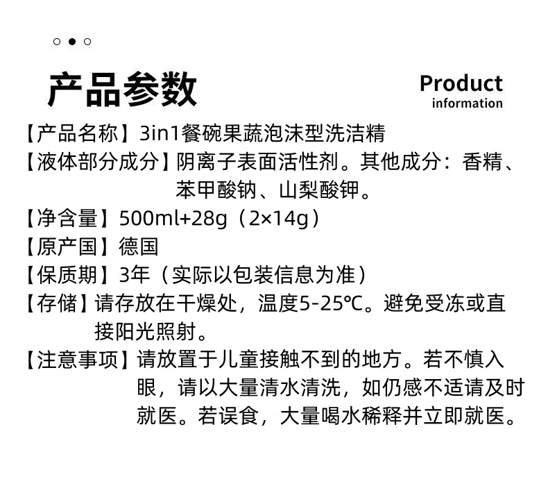 德国进口卫丫3in1餐碗果蔬泡沫型洗洁精500ml+28g