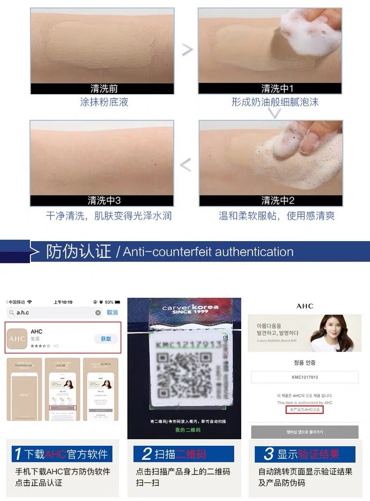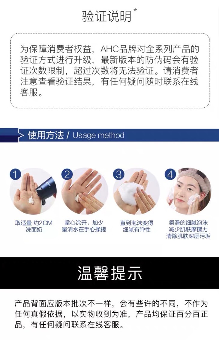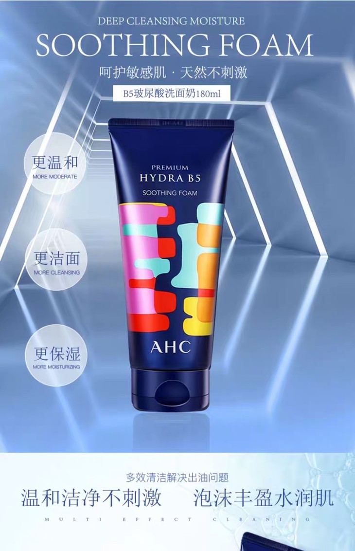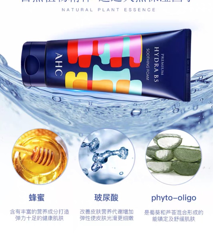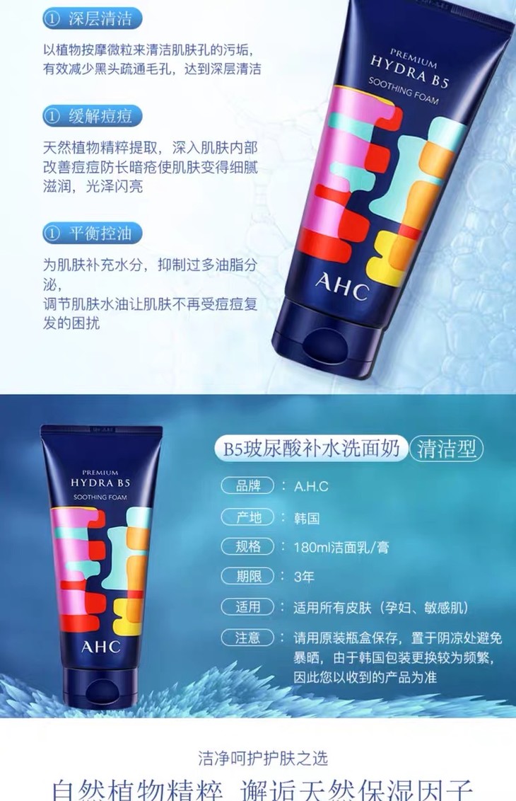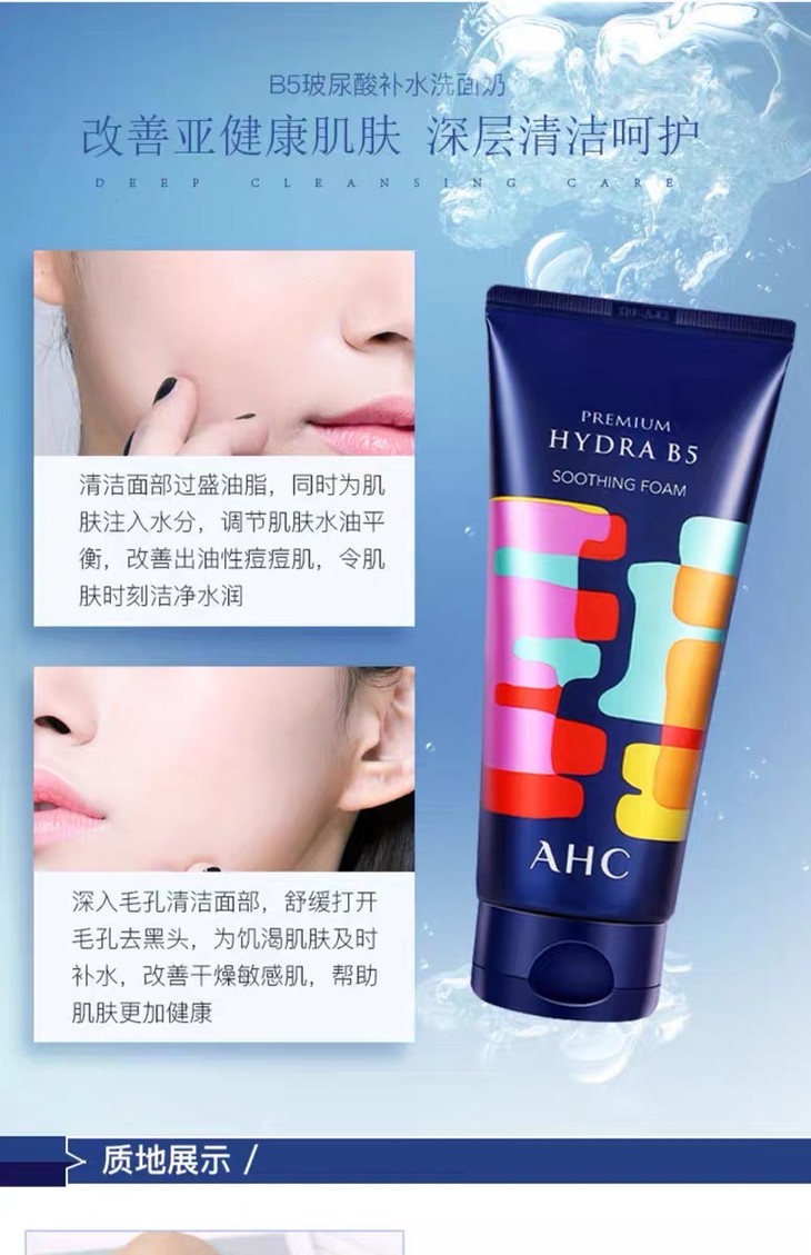 3、功效:ahc洗面奶,孕妇、哺乳期、敏感肌的首选洁面产品~唯一款含有玻尿酸精华洗面奶,锁水性非常好,洗完不会紧绷 同时它的清洁度也很强,去除老化角质、抗氧化 超大支180毫升。