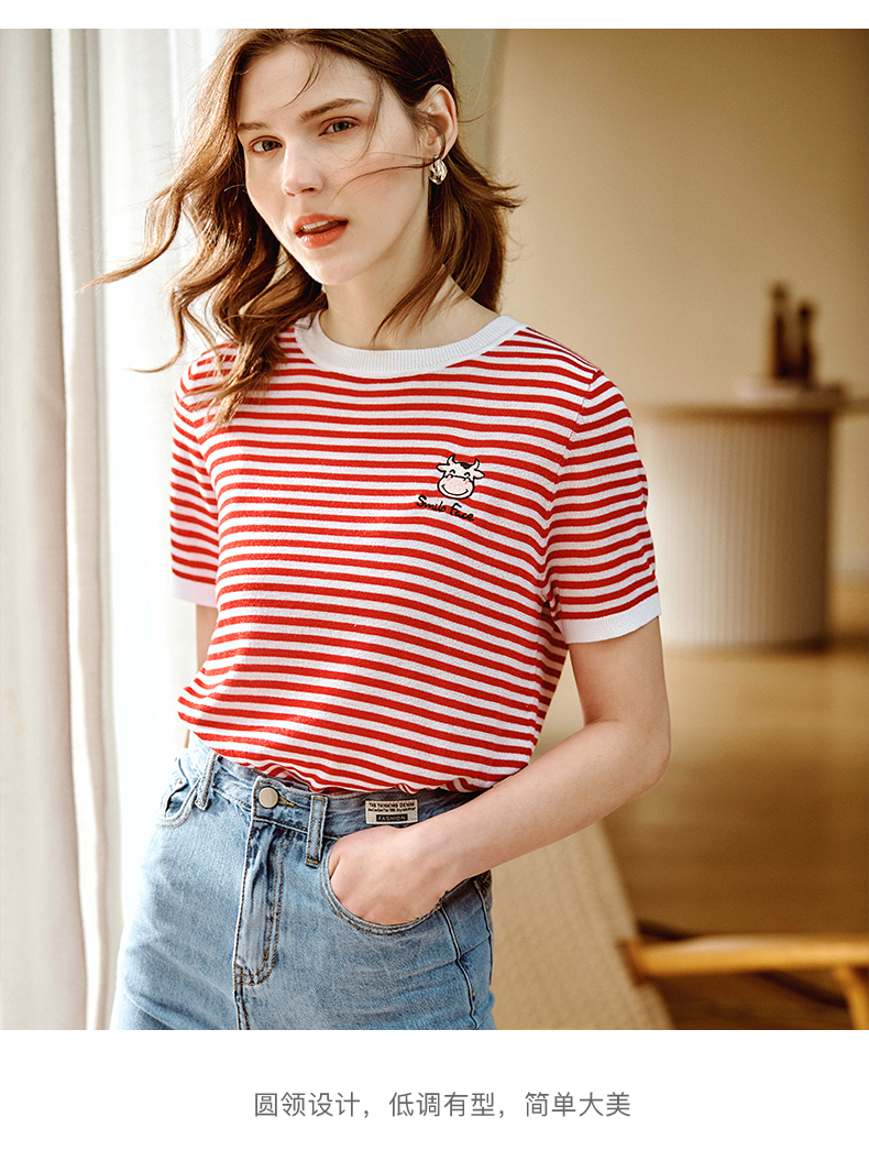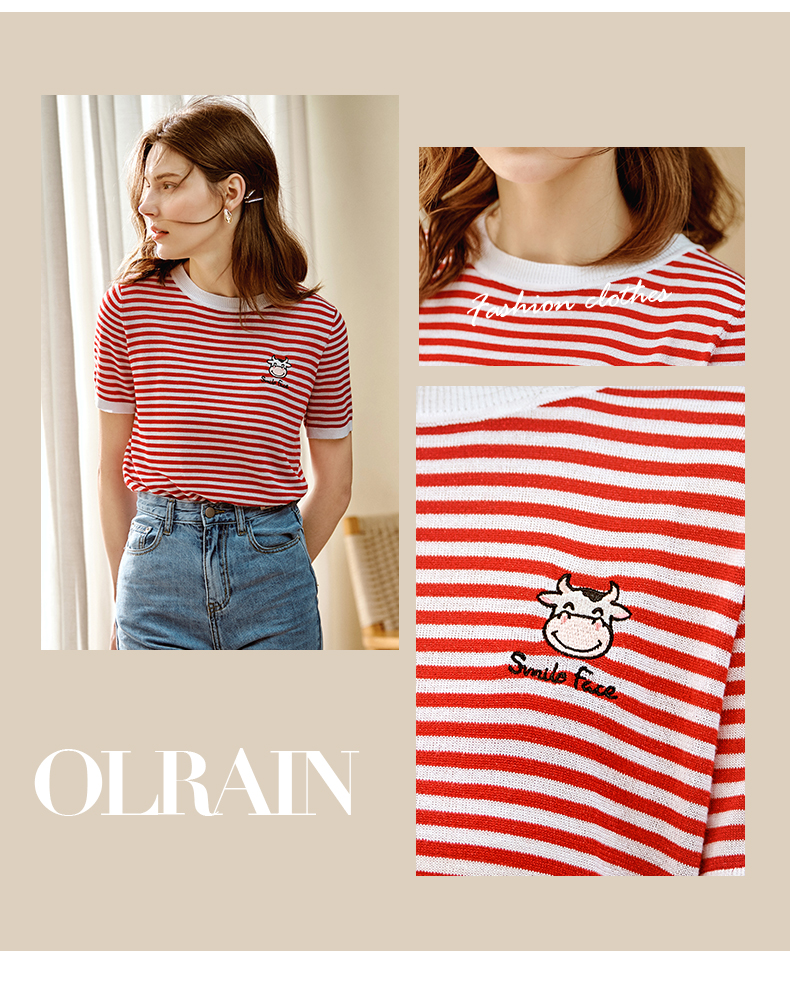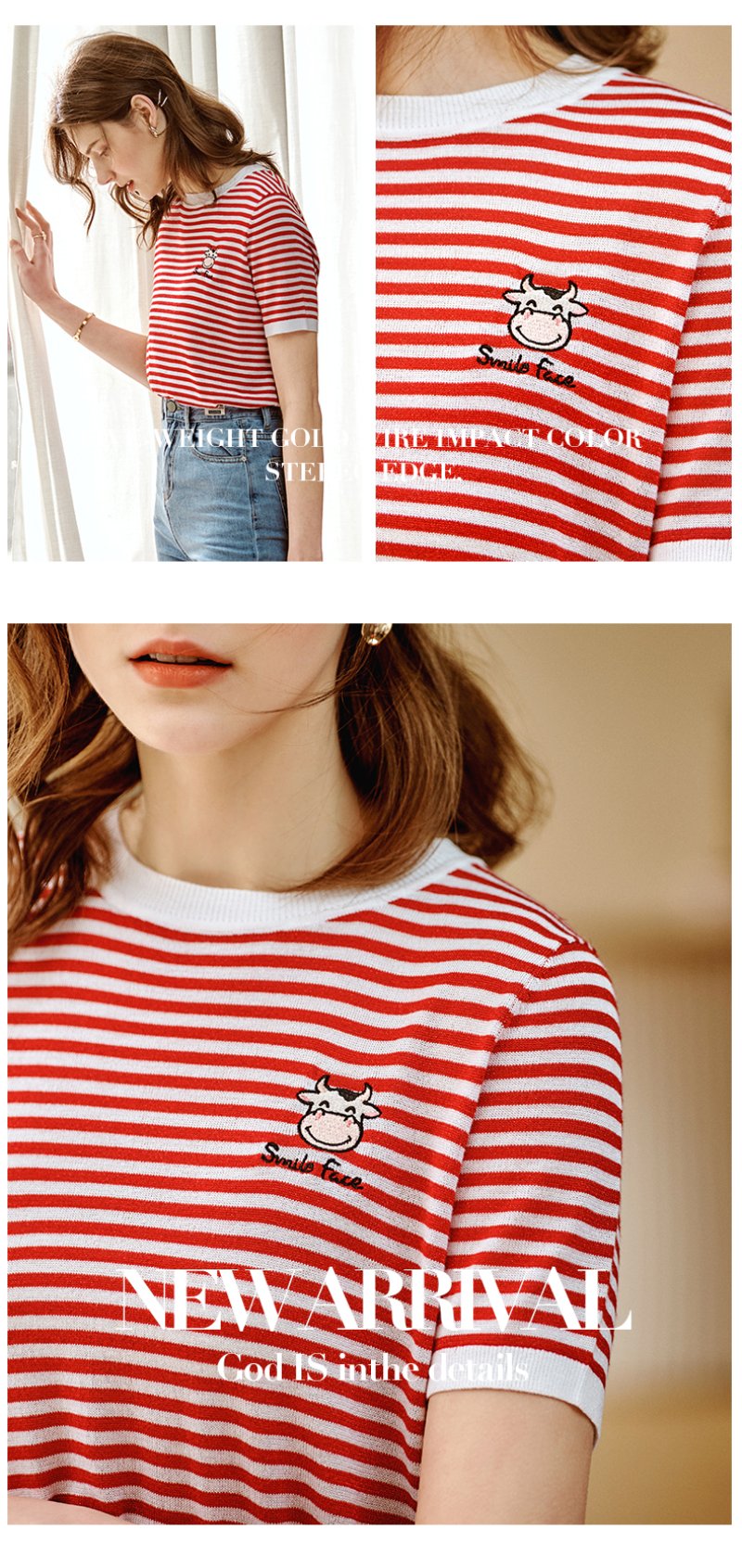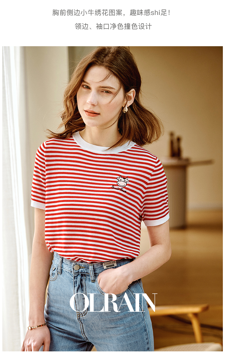【秒杀专享】欧芮儿条纹针织衫女2021春夏新款小牛绣花圆领短袖修身宽松上衣