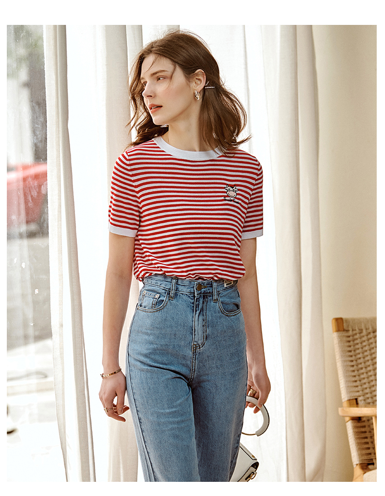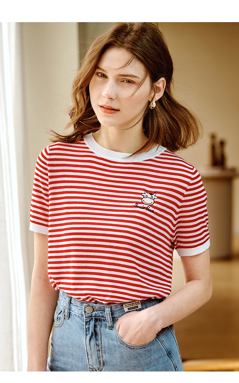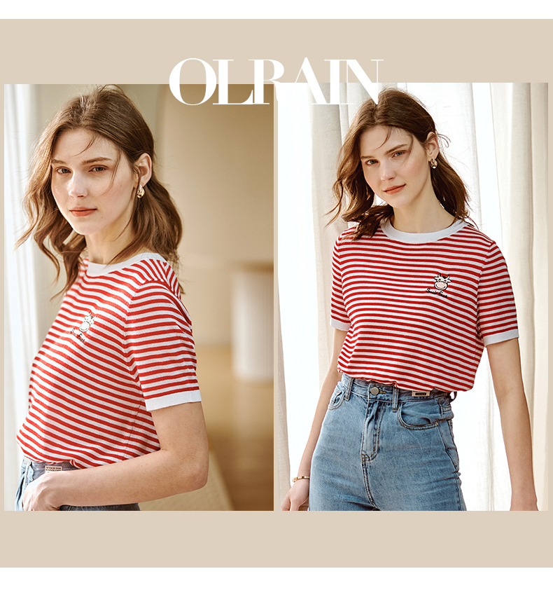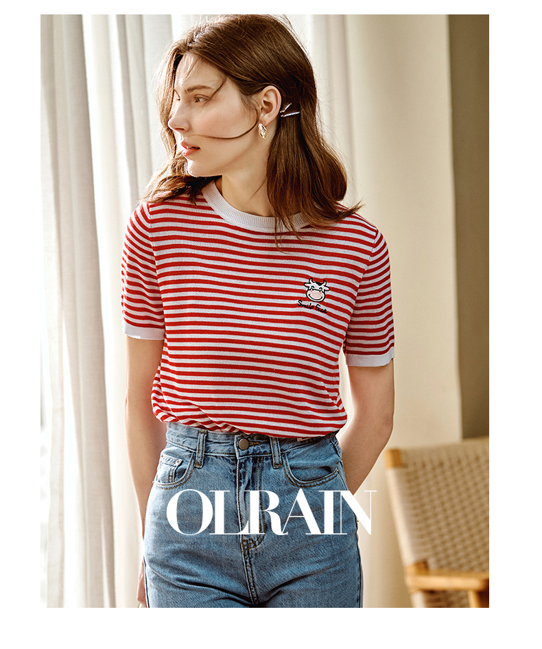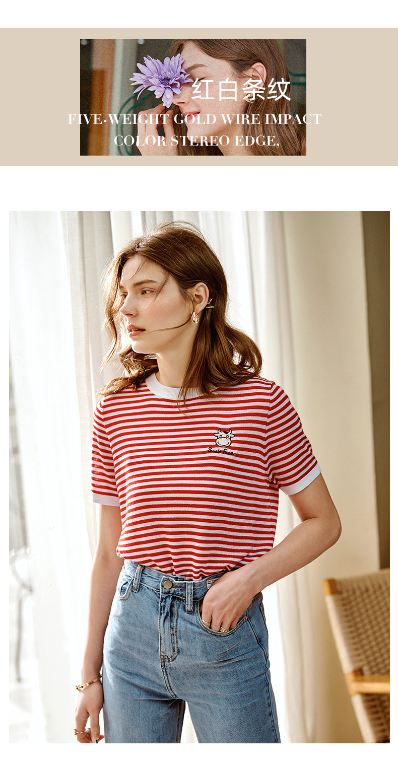 【秒杀专享】欧芮儿条纹针织衫女2021春夏新款小牛绣花圆领短袖修身宽松上衣