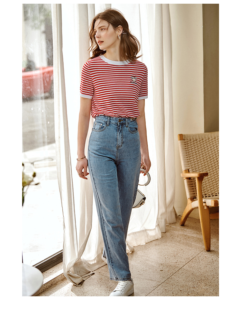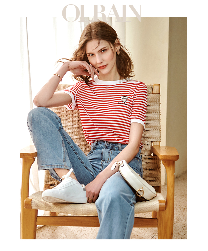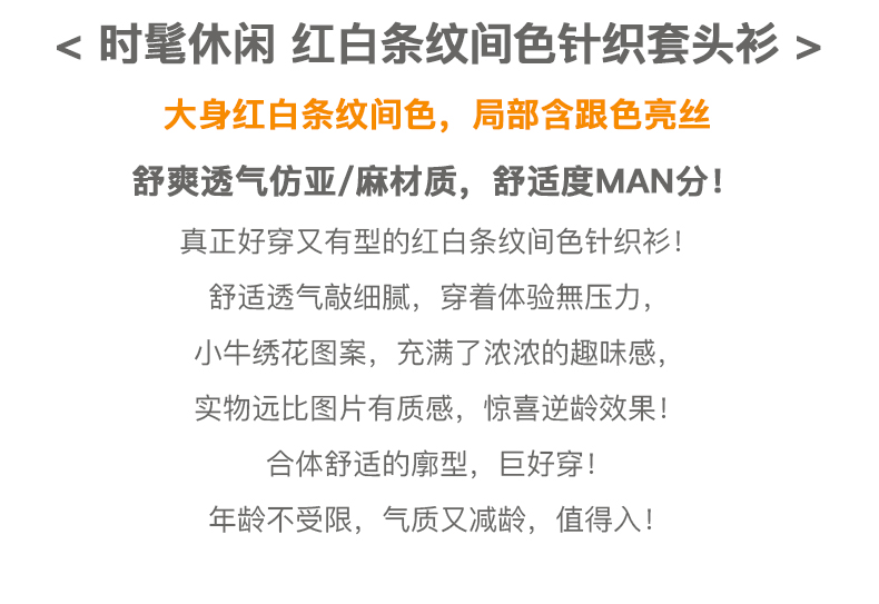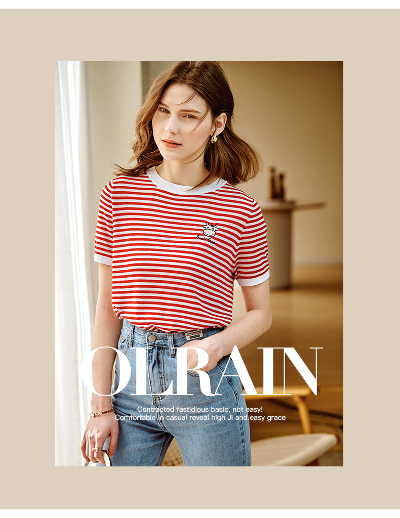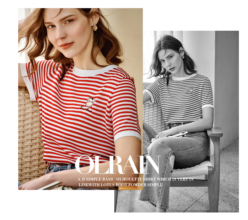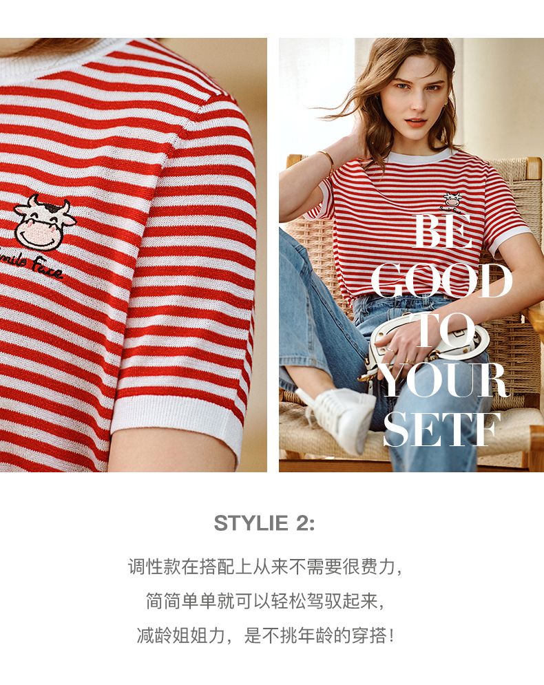 【秒杀专享】欧芮儿条纹针织衫女2021春夏新款小牛绣花圆领短袖修身宽松上衣