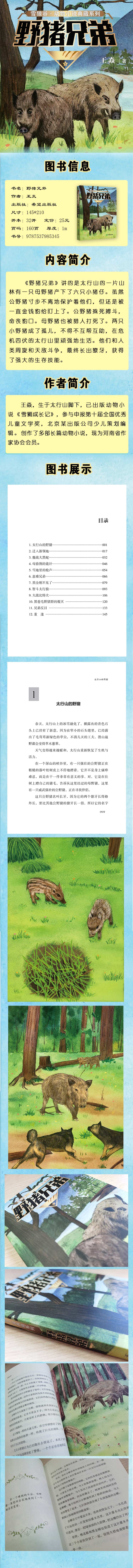 《野猪兄弟》讲的是太行山的一片山林有一只母野猪产下了六只小猪仔。虽然公野猪寸步不离地保护着他们,但还是被一直金钱豹给盯上了。公野猪殊死搏斗,命丧豹口。母野猪也被猎人打死了。两只小野猪成了孤儿,不得不互帮互助,在危机四伏的太行山里顽强地生活。他们和人类周旋和天敌斗争,最终长出獠牙,获得了强大的生存技能。