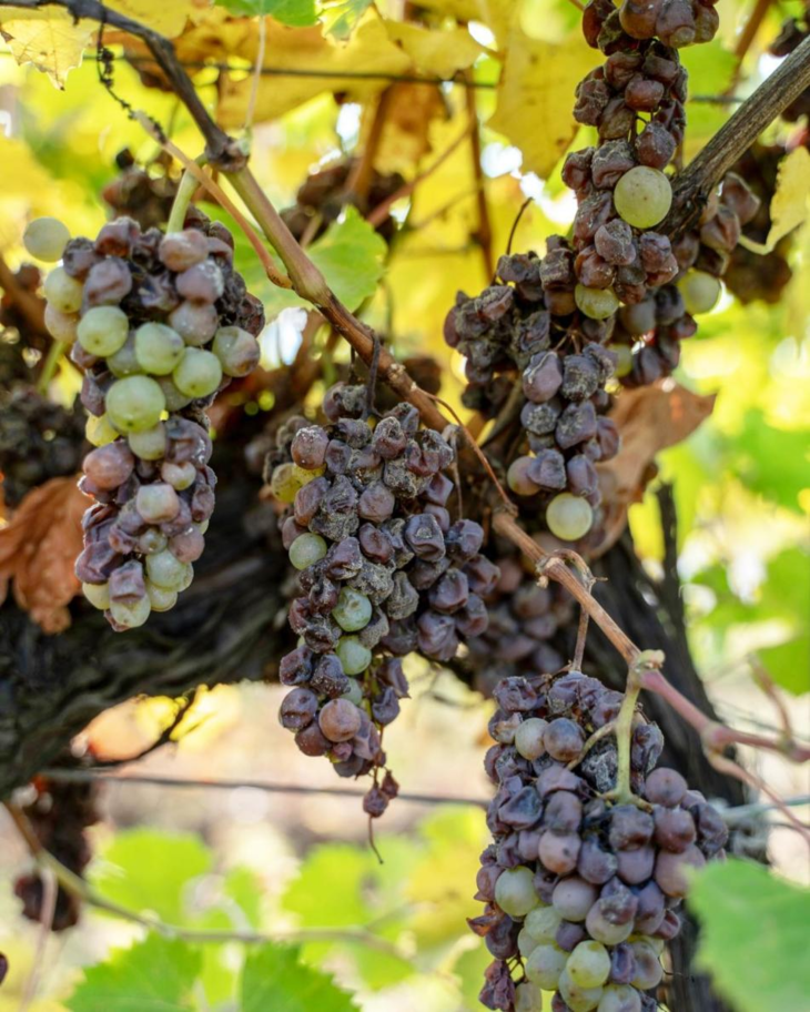 完全感染贵腐菌的葡萄酿制的甜白。这样的葡萄会被单独采摘下来,需要工人在葡萄园中来回穿梭多次,人工成本很高。