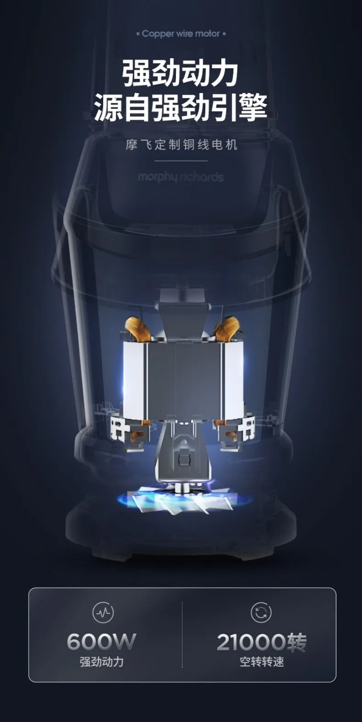 摩飞MR9501破壁机采用的是物理角度的设计,钝刀、切刀、搅拌刀,三种刀片一起配合,一共有6叶刀片,用很久刀片依旧耐用,每天一杯果蔬汁也能够让大家喝出健康~