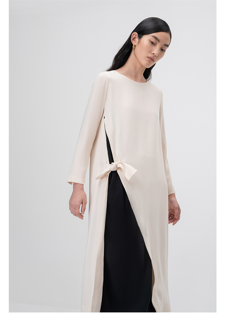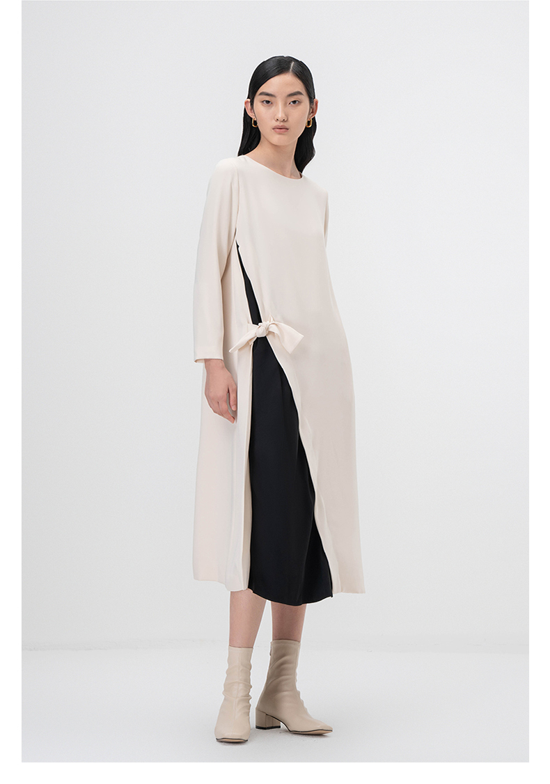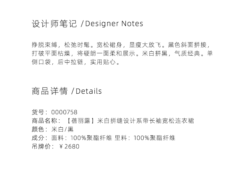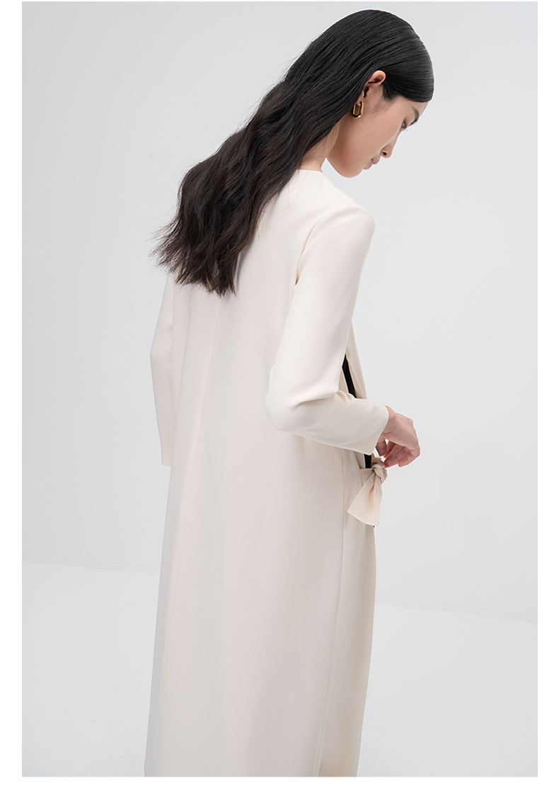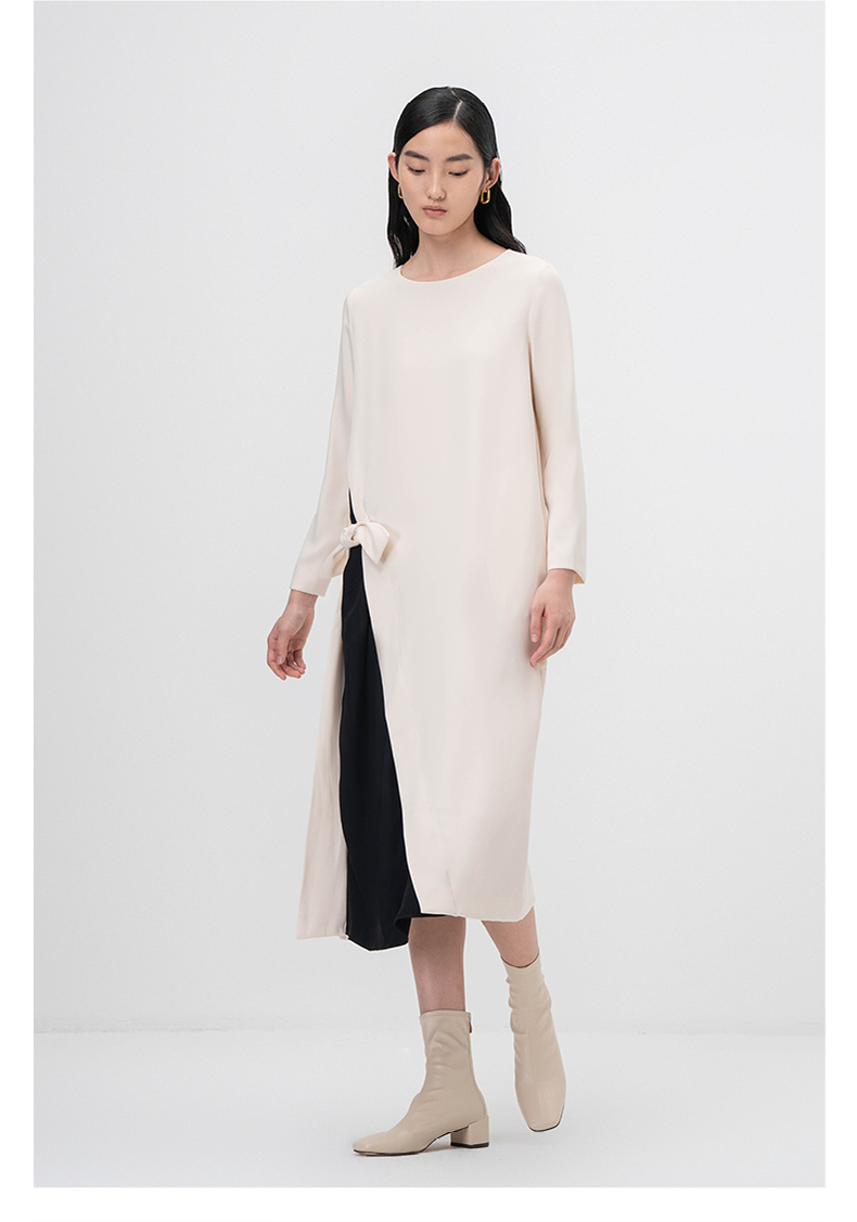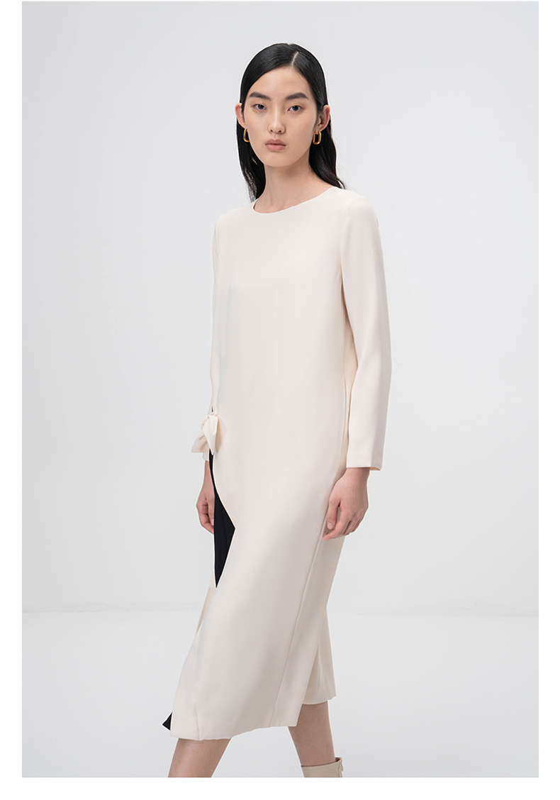 【蓓丽露】米白拼缝设计系带长袖宽松连衣裙/0000758