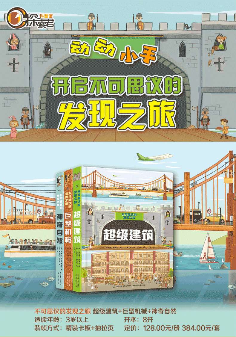 “不可思议的发现之旅”是一套大开本拉页卡板书,系列包含《神奇自然》《超级建筑》《巨型机械》三册。每册图书5个大型场景,每个场景都有左右2个滑动大拉页,展现内容的全景图。从场景简介到细节知识点,再加入找找看看元素,搭配独特的手绘画风,吸引孩子主动阅读、反复阅读。