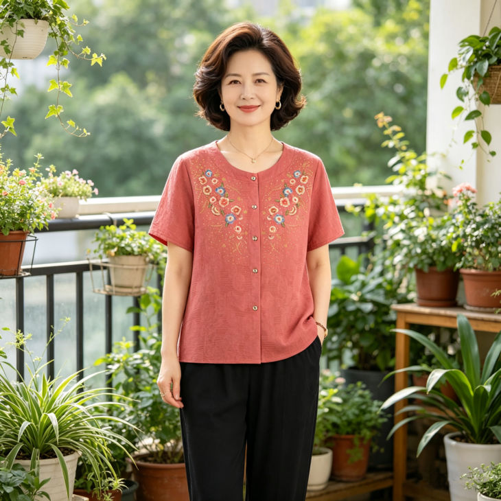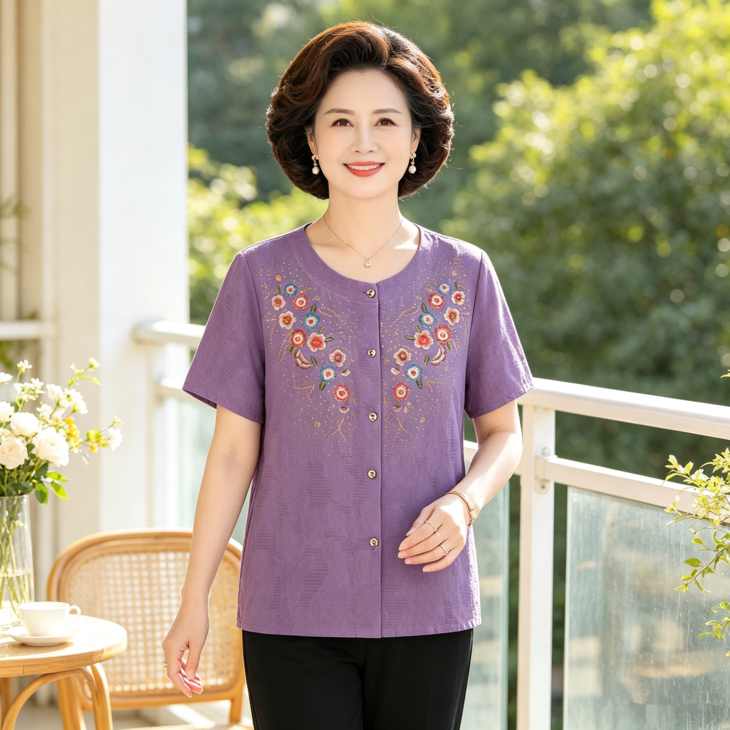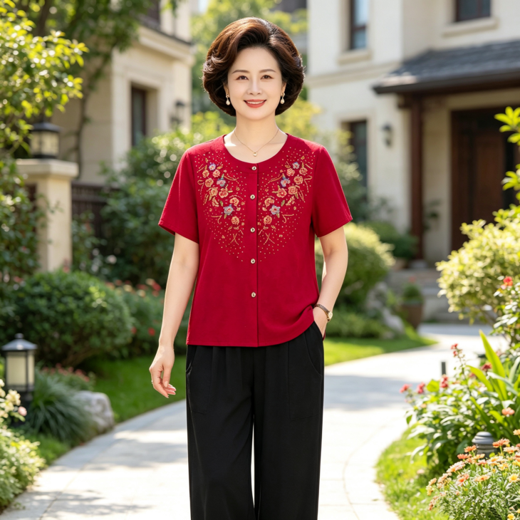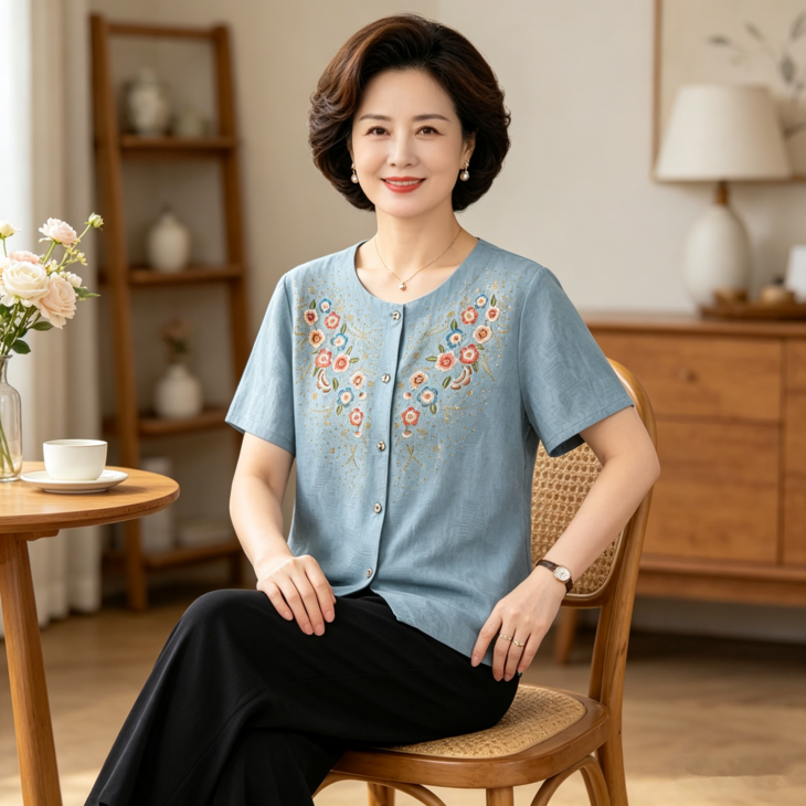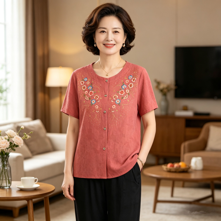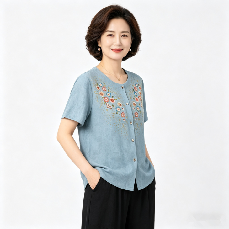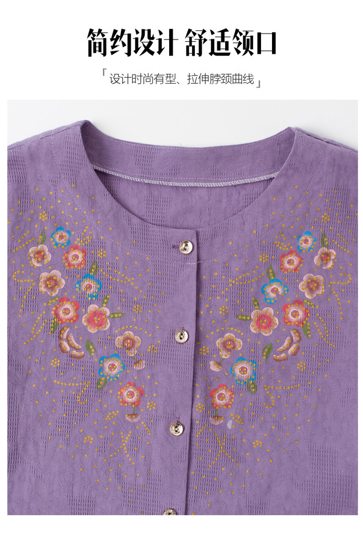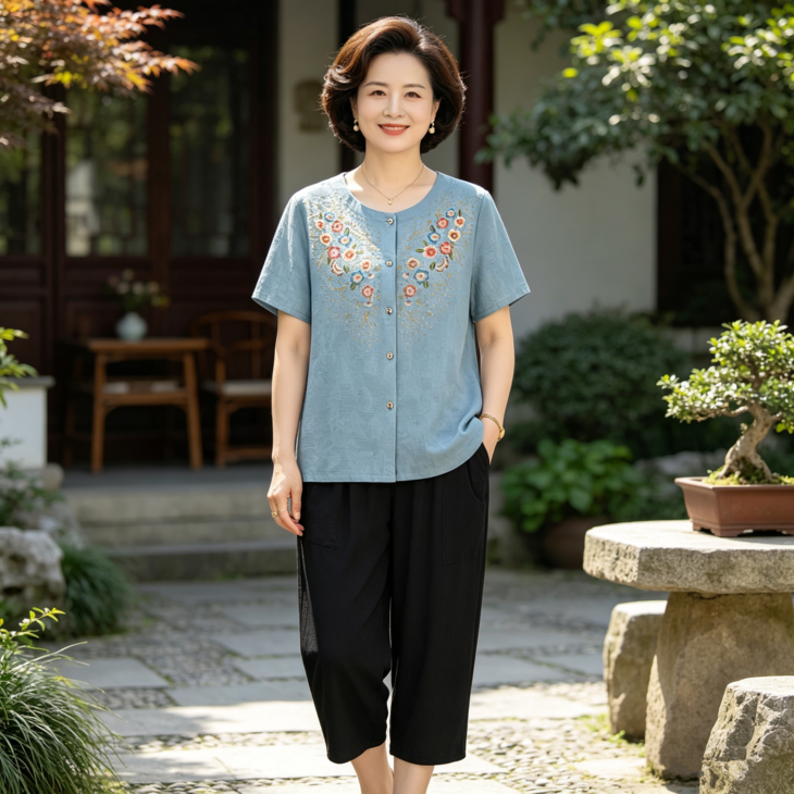 夏日温柔,从这套国风印花套装开始~圆领设计修饰脖颈,宽松版型藏肉显瘦,对中老年身材超友好✨ 精致花卉点缀领口,细节满满尽显雅致~ 质感透气亲肤,夏天穿清爽不闷汗~ 短袖衬衫+黑色长裤一套配齐,出门遛弯、走亲访友都得体,轻松穿出妈妈的优雅气质 给妈妈一份贴心礼物,让她在夏日里舒适又好看~