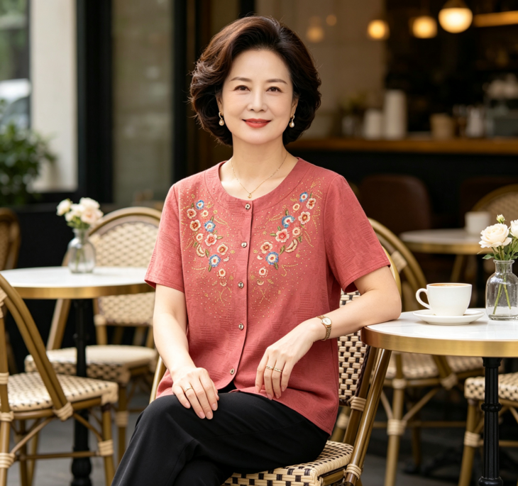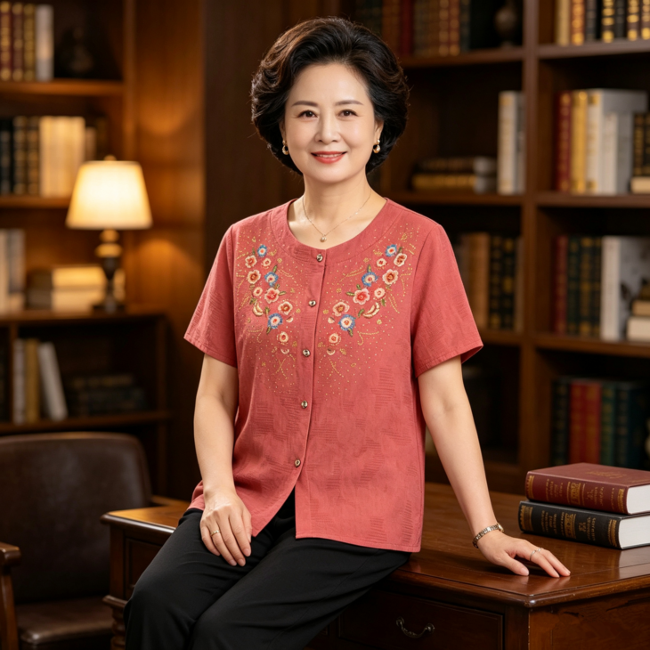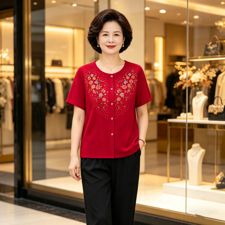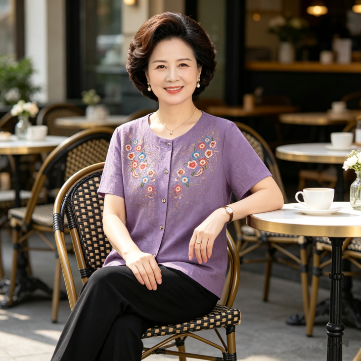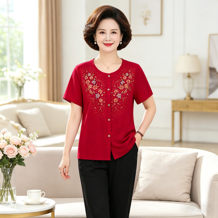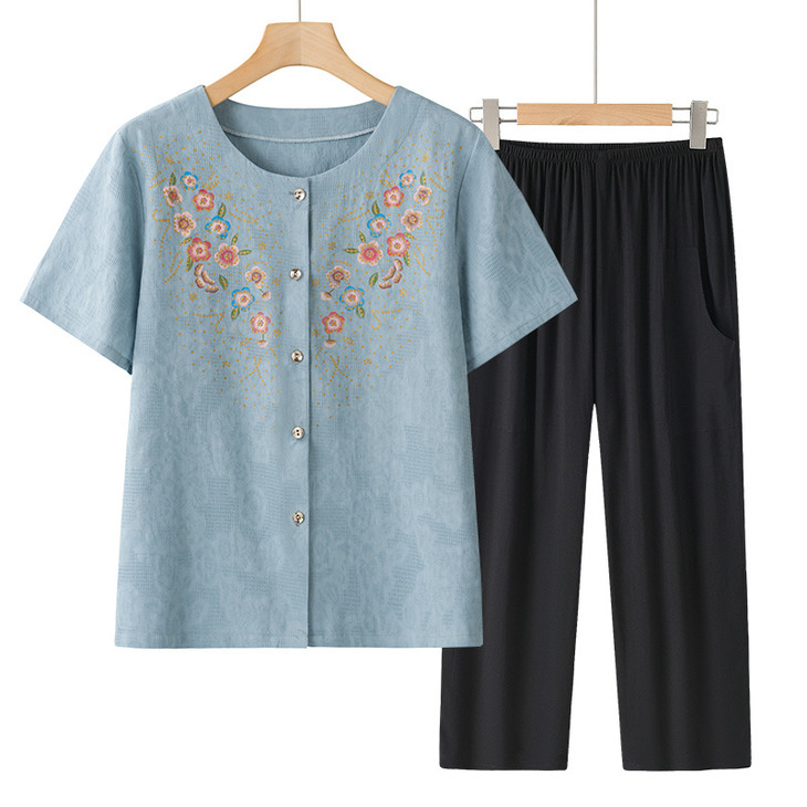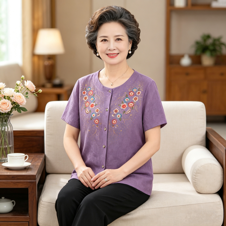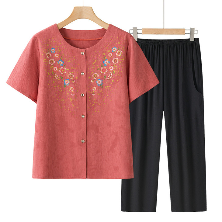 夏日温柔,从这套国风印花套装开始~圆领设计修饰脖颈,宽松版型藏肉显瘦,对中老年身材超友好✨ 精致花卉点缀领口,细节满满尽显雅致~ 质感透气亲肤,夏天穿清爽不闷汗~ 短袖衬衫+黑色长裤一套配齐,出门遛弯、走亲访友都得体,轻松穿出妈妈的优雅气质 给妈妈一份贴心礼物,让她在夏日里舒适又好看~