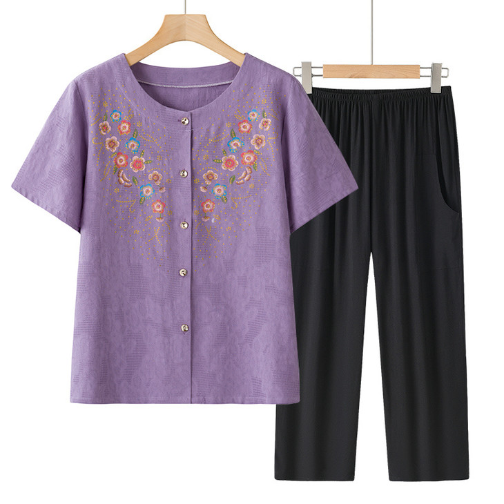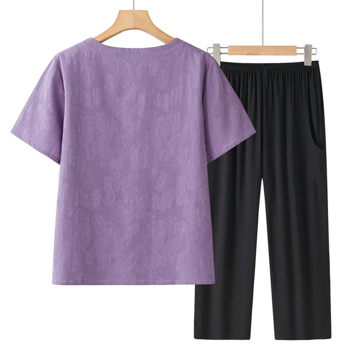 💜妈妈夏季刚需!舒适透气+国风印花,一套配齐,显白又遮肉,送礼自留都绝了! 🔥中老年妈妈夏日穿搭天花板!繁花印花套装,宽松不勒、清爽不闷汗,出门直接穿,体面又好看! 给妈妈的夏日温柔✨ 精美印花短袖+黑裤套装,材质亲肤,雅致减龄,遛弯、走亲访友都得体~