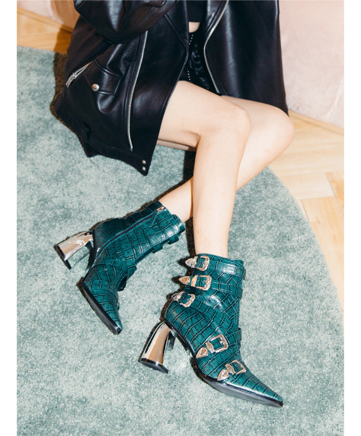 lost in echo西部金属饰扣高跟短靴2019秋季上新鳄鱼纹绿色尖头女靴