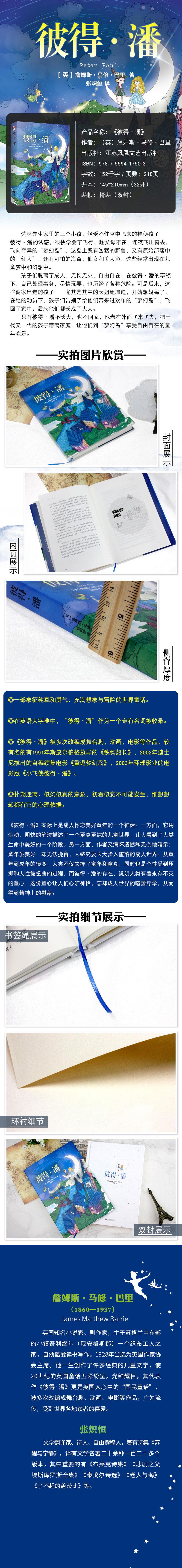 詹姆斯•马修•巴里(1860—1937),英国著名小说家、剧作家,生于苏格兰中东部的小镇奇利缪尔(现安格斯郡)一个织布工人之家,自幼酷爱读书写作。1928年当选为英国作家协会主席。他一生创作了许多经典的儿童文学,使20世纪的英国童话五彩纷呈,光鲜耀目,其代表作《彼得•潘》更是英国人心中的“国民童话”,被多次改编成舞台剧、动画、电影等作品,广为流传,受到世界各地读者的喜爱。
