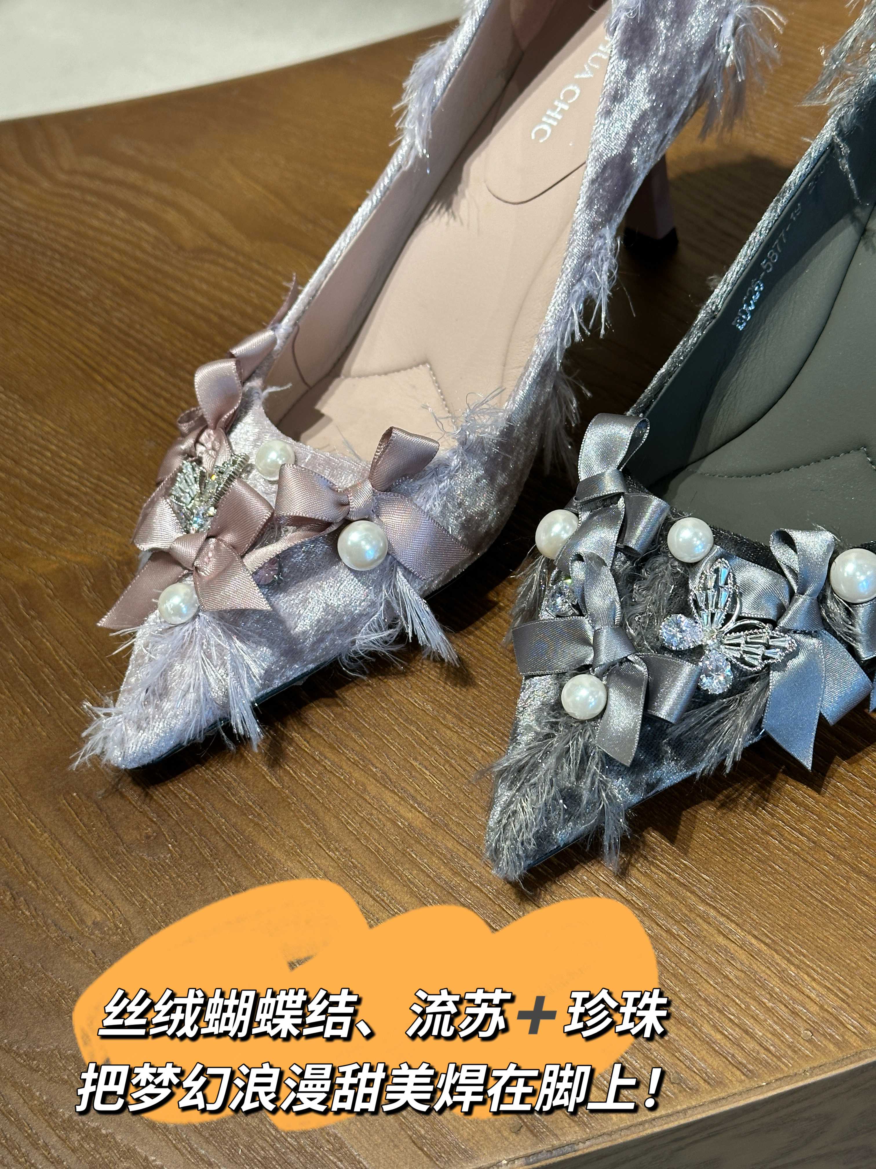 女神节温柔暴击✨丝绒蝴蝶高跟鞋! 内里全羊皮超级软糯舒适!这双真的把梦幻浪漫甜美焊在脚上! 软糯丝绒+精致蝴蝶结,自带细闪氛围感, 粉色温柔减龄,绿色高级显白,闭眼入都不踩雷!
