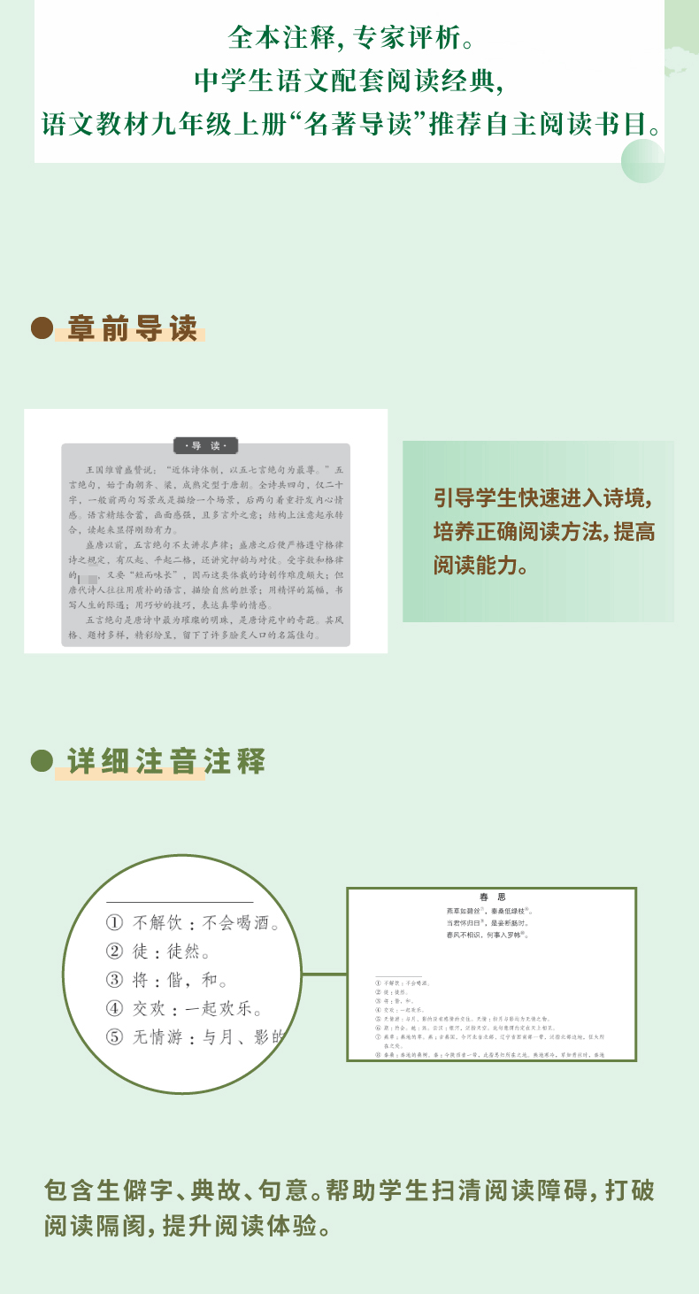 1.中学生语文配套阅读经典,语文教材九年级上册“名著导读”推荐自主阅读书目;收录《登高》《望岳》等必背篇目,详解评析,助力语文能力提升,轻松通关考试。2.章前导读。引导学生快速进入诗境,培养正确阅读方法,提高阅读能力。3.详细注音注释,包含生僻字、典故、句意。帮助学生扫清阅读障碍,打破阅读隔阂,提升阅读体验。4.文前精编诗人介绍。从诗歌走进诗人与历史,读诗更是读人。5.文后设置详细评析与延伸思考,让学生理解唐诗韵味之美的同时拓展思维,让阅读不止于文本。6.问世二百余年,畅销至今,家喻户晓;熟读唐诗三百首,不会作诗也会吟。7.古典诗歌的“启蒙读本”,学生时代的“励志礼物”,不同时代的唐诗总是带来不一样的感受。