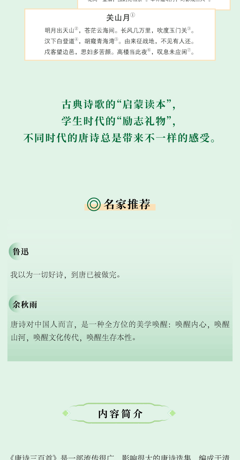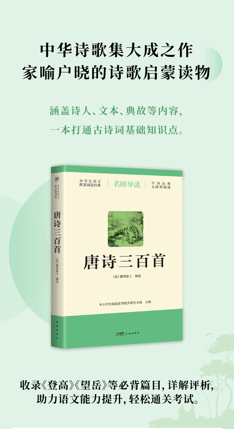 《唐诗三百首》是一部流传很广、影响很大的唐诗选集,编成于清乾隆二十八年(1763),署名蘅塘退士。在深化经典阅读,传承传统文化的今天,《唐诗三百首》是展示唐诗风华的重要载体。此次出版,在诗歌文本的基础上,新增加了“导读”“诗人介绍”“评析”“延伸思考”“注释”等板块,便于学生走入诗境,理解诗意。