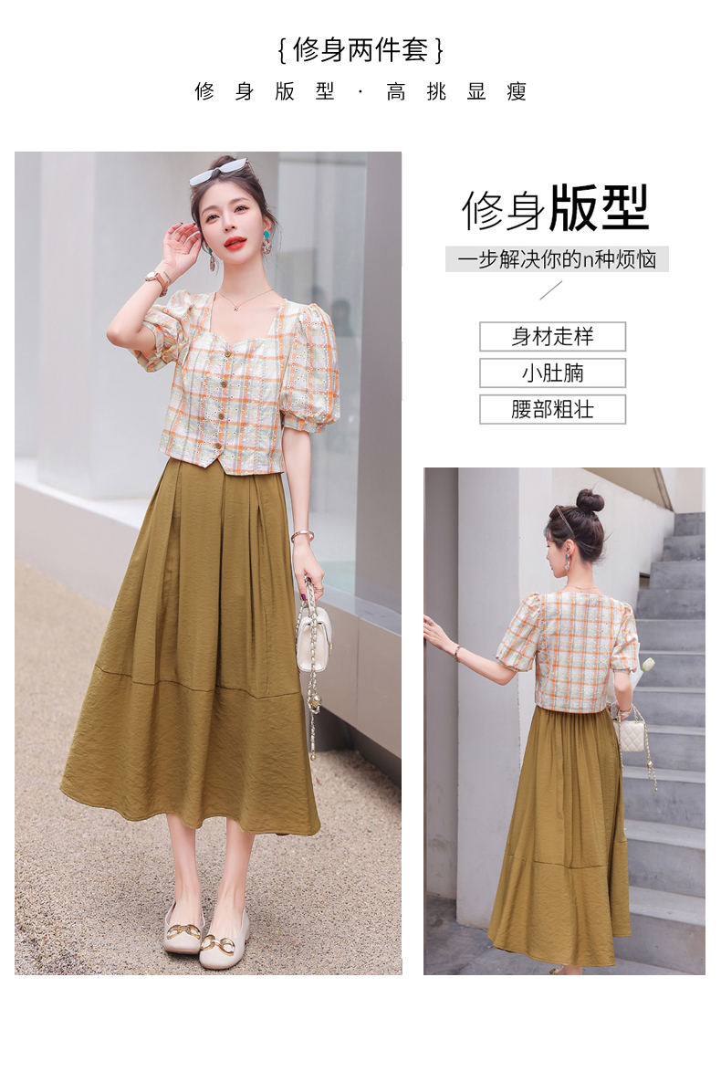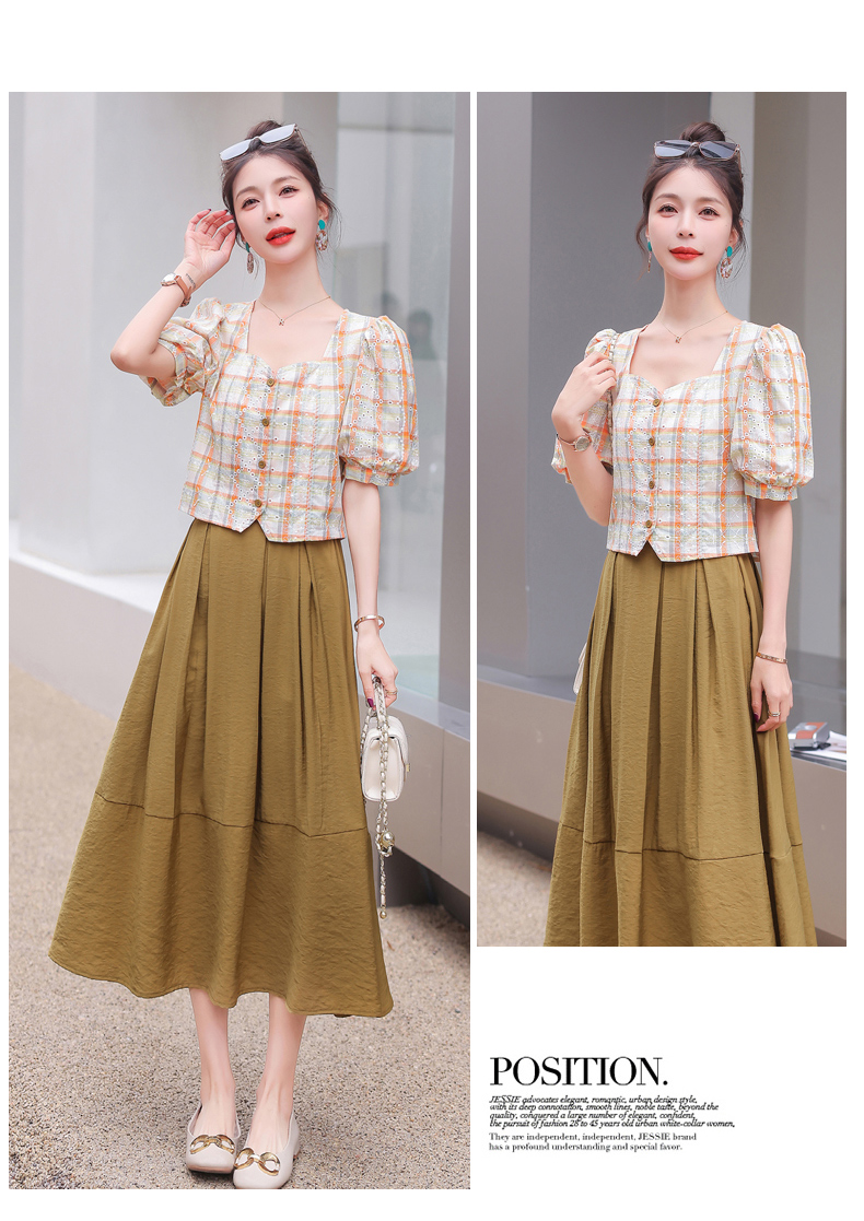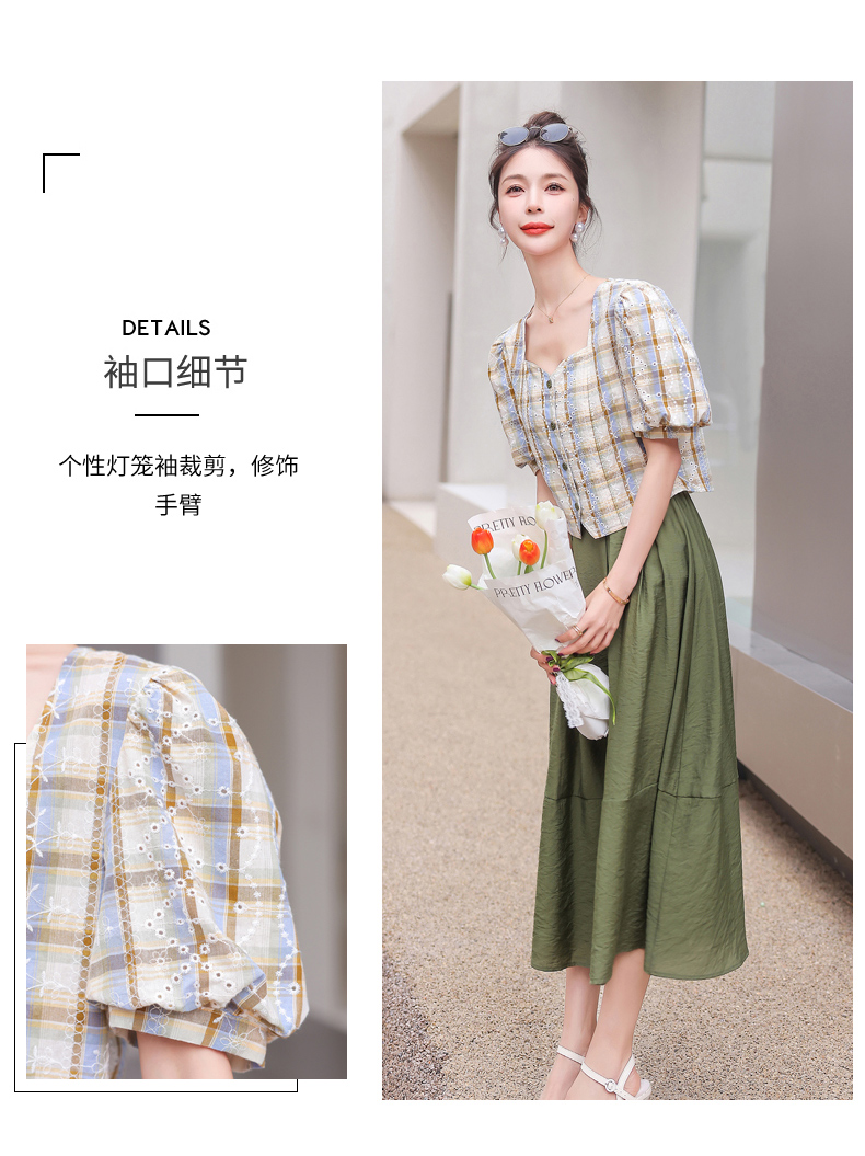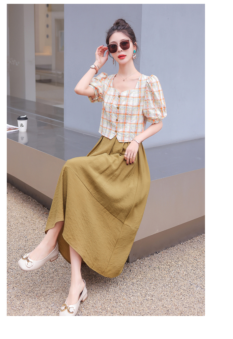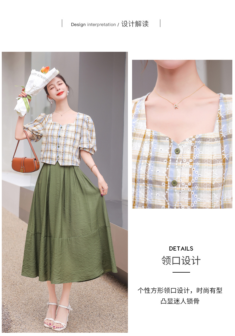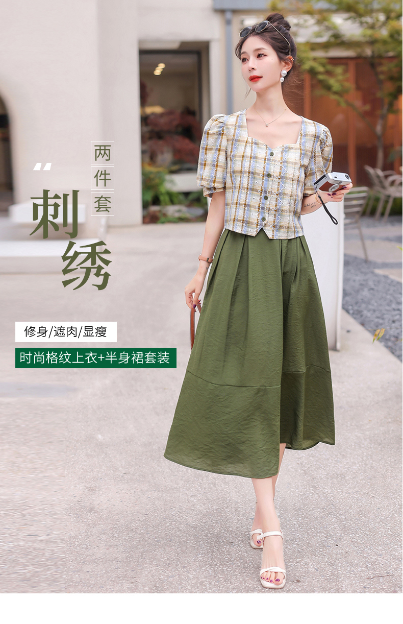 舒适棉麻,格子刺绣泡泡袖方领短袖上衣+纯色半裙套装HR-NSYY2306-5