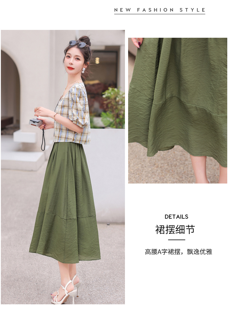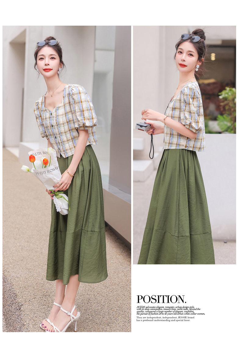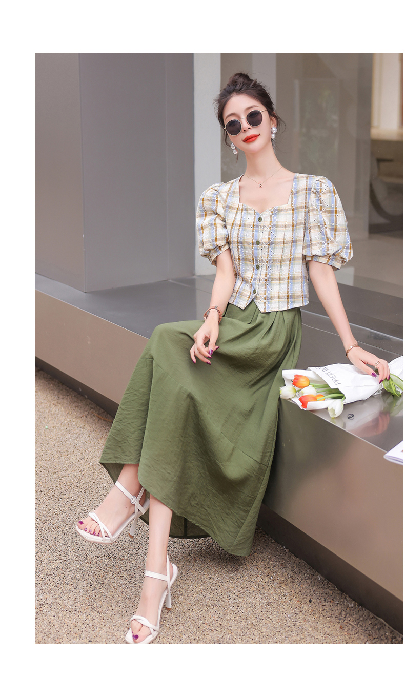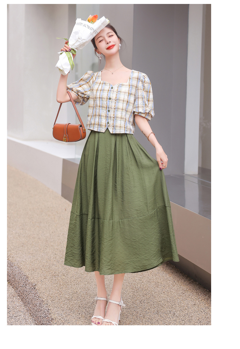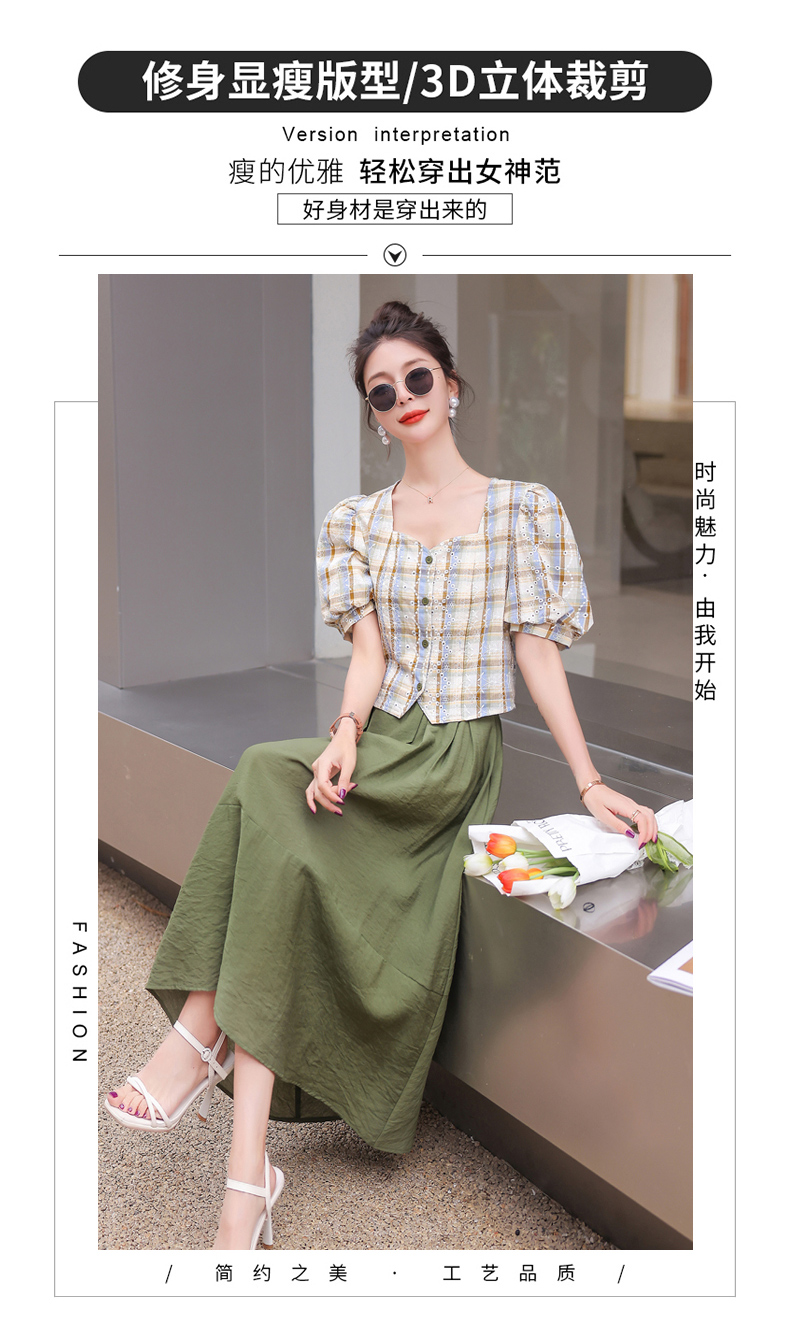舒适棉麻,格子刺绣泡泡袖方领短袖上衣+纯色半裙套装HR-NSYY2306-5
