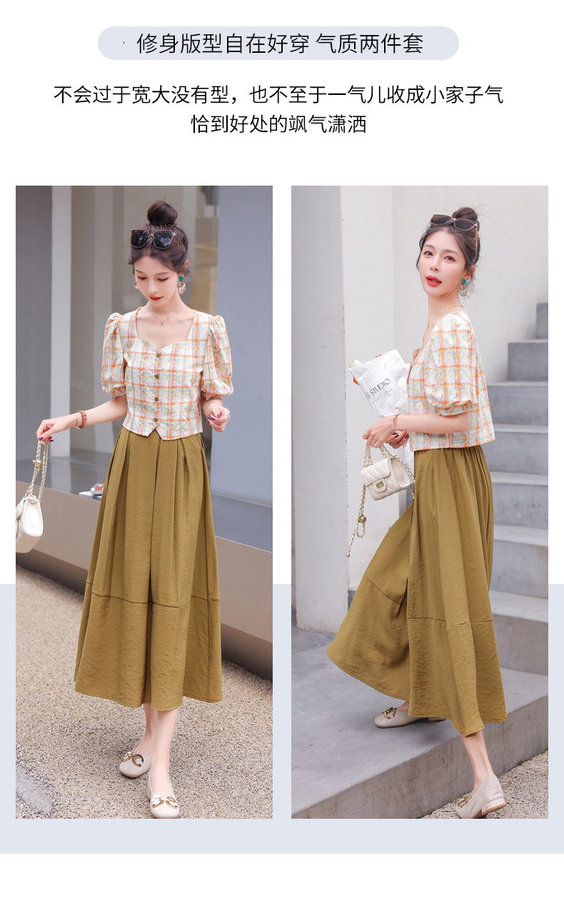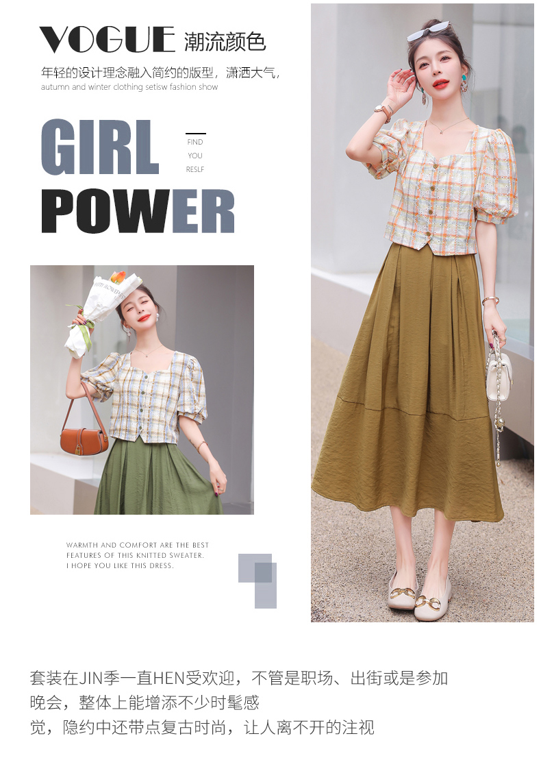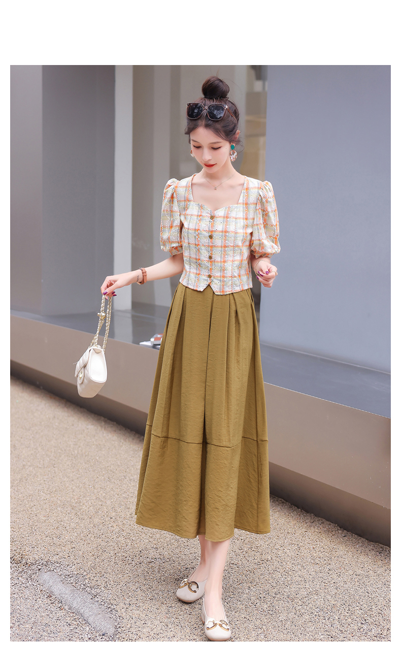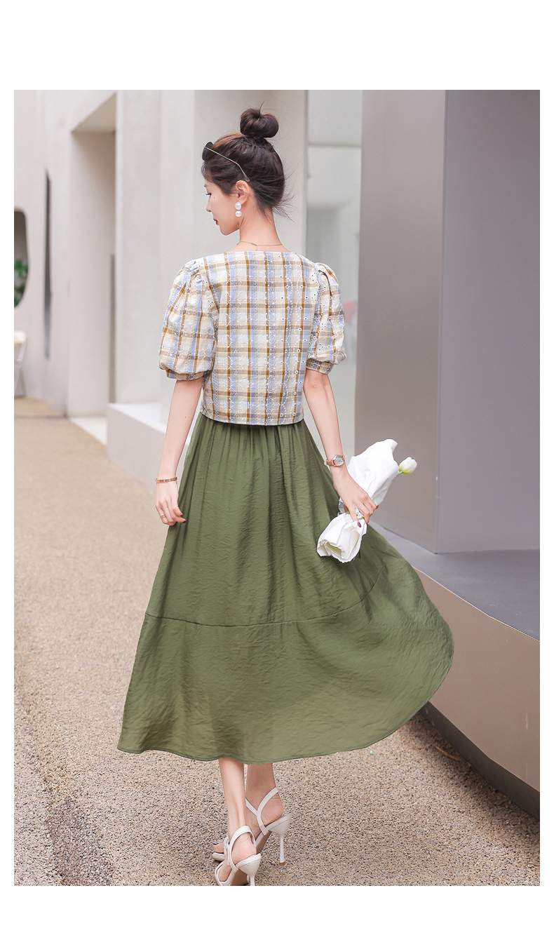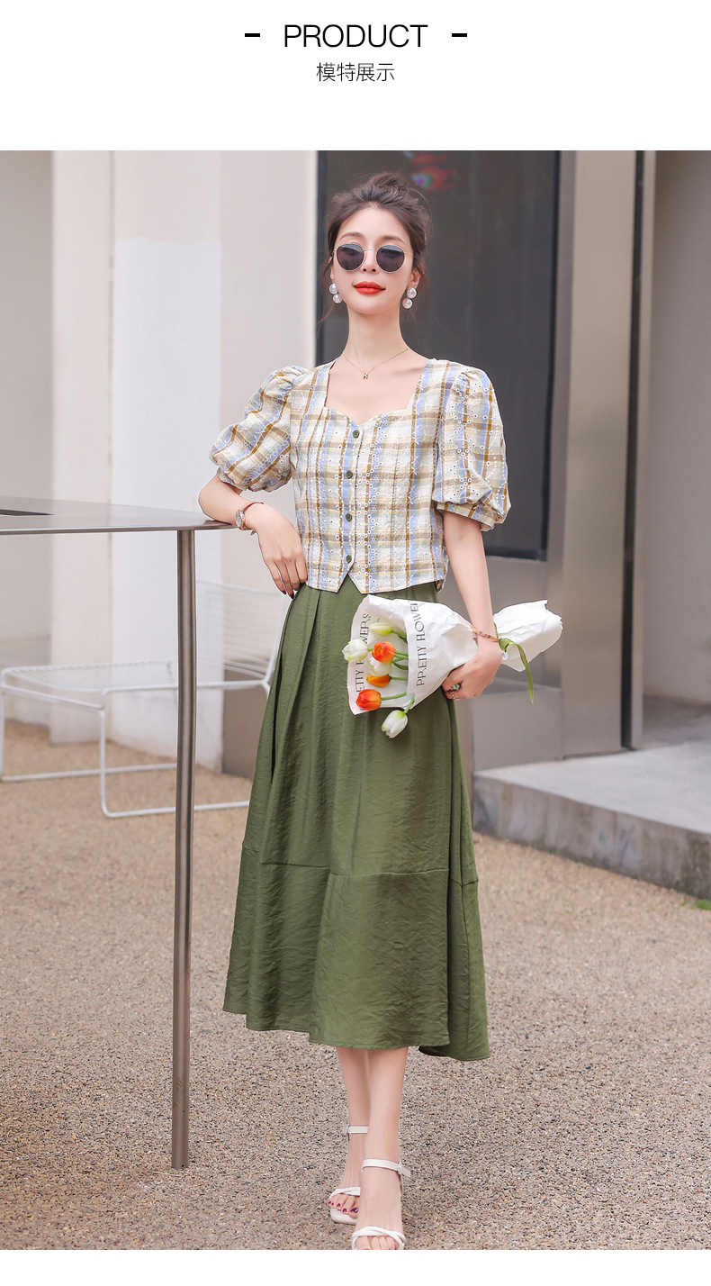 舒适棉麻,格子刺绣泡泡袖方领短袖上衣+纯色半裙套装HR-NSYY2306-5