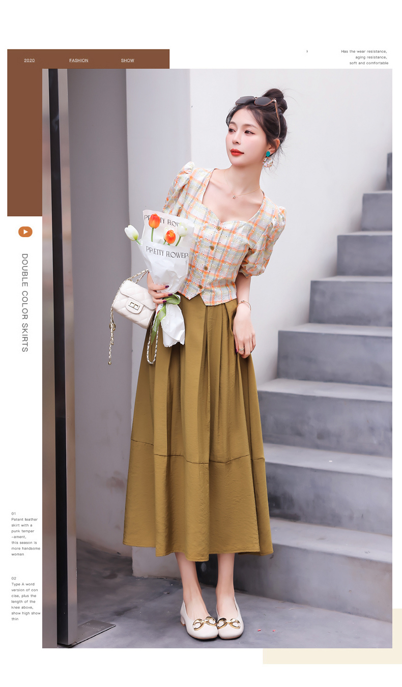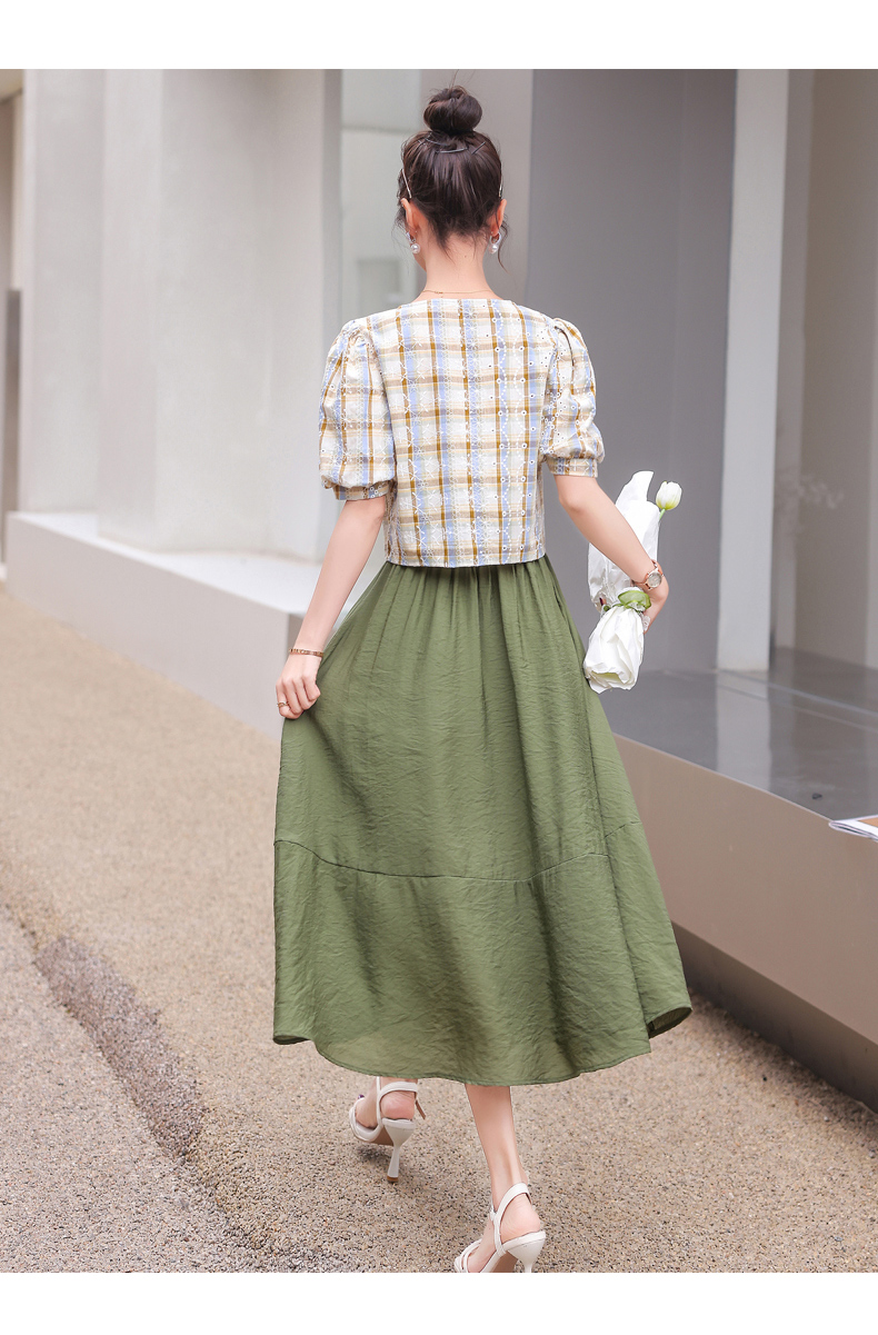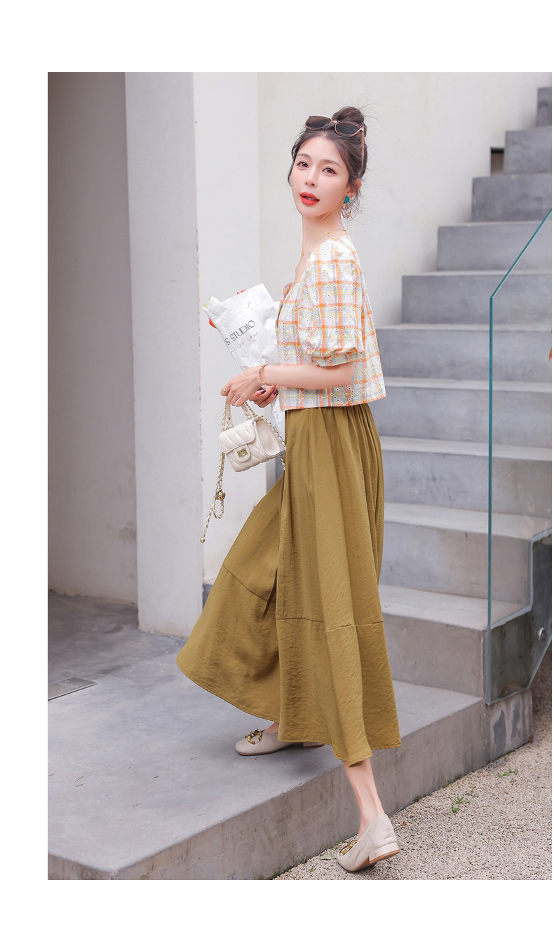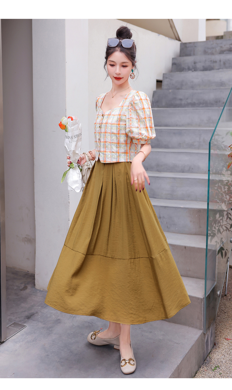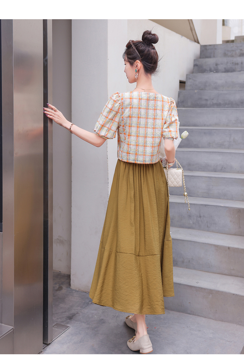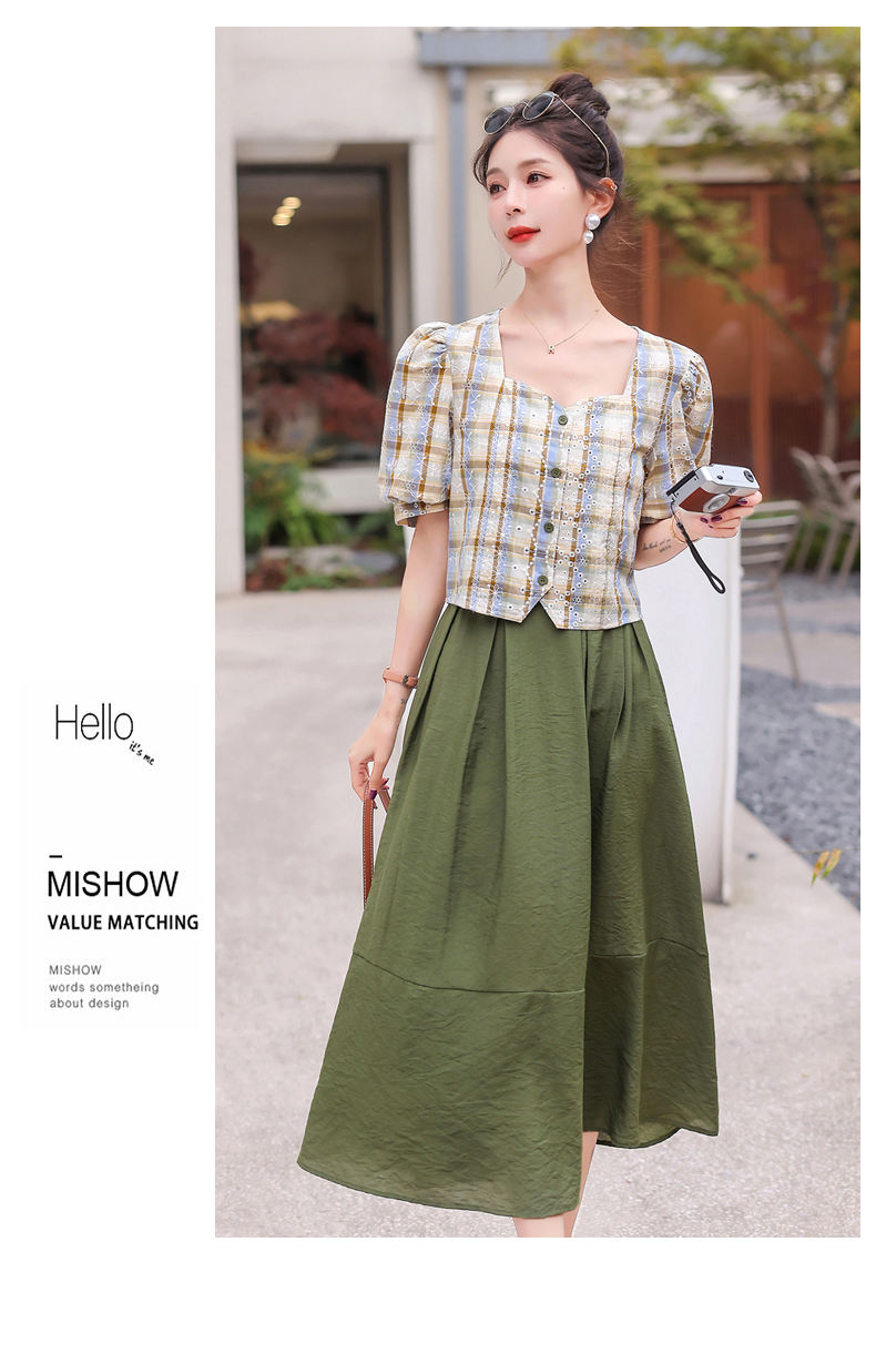 舒适棉麻,格子刺绣泡泡袖方领短袖上衣+纯色半裙套装HR-NSYY2306-5