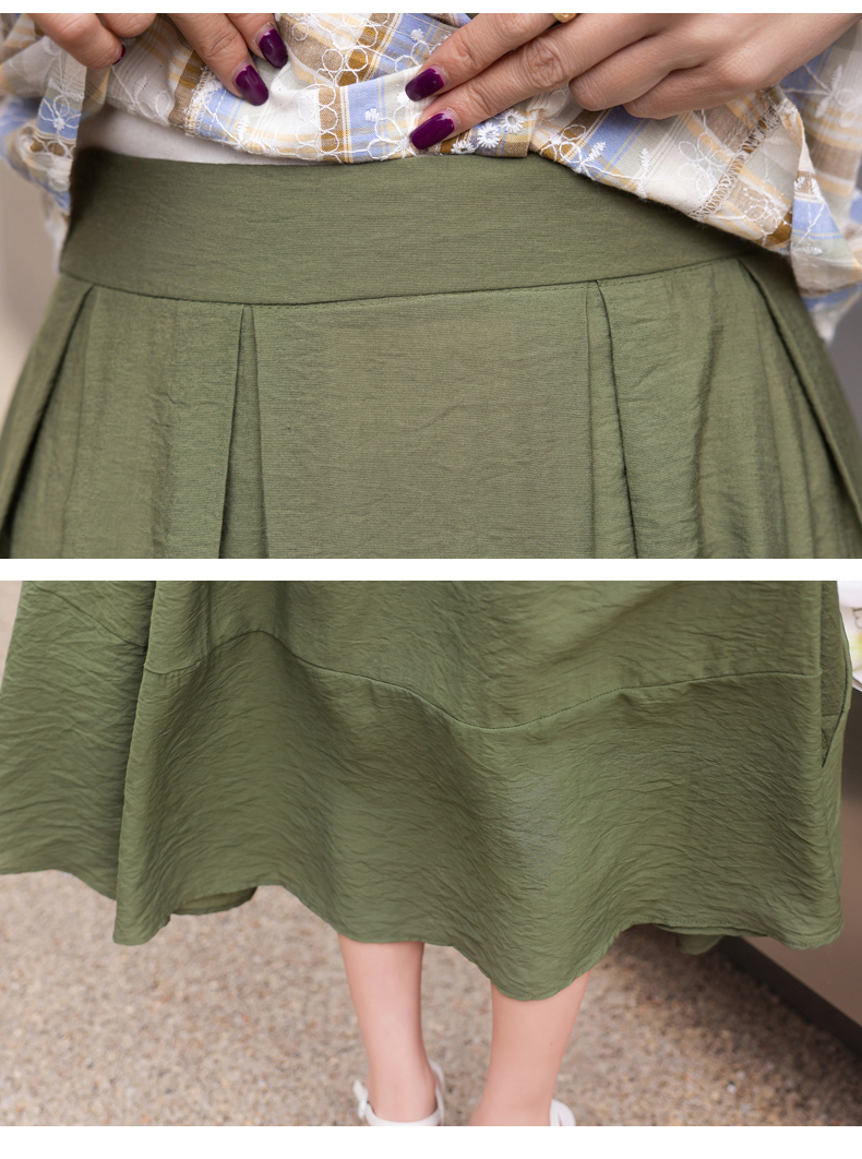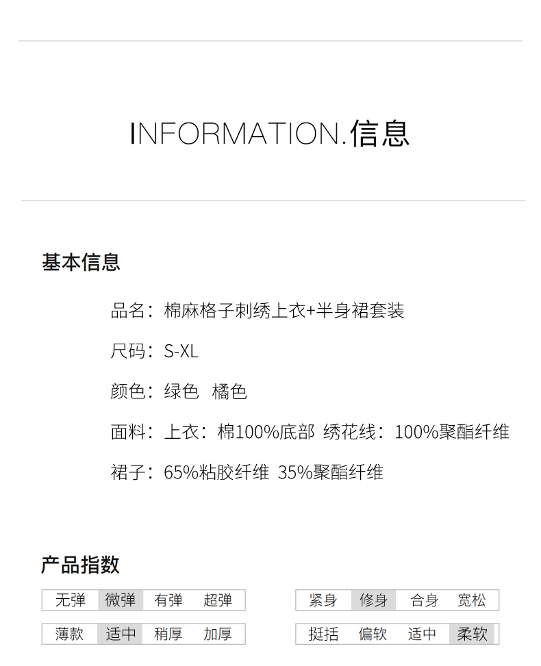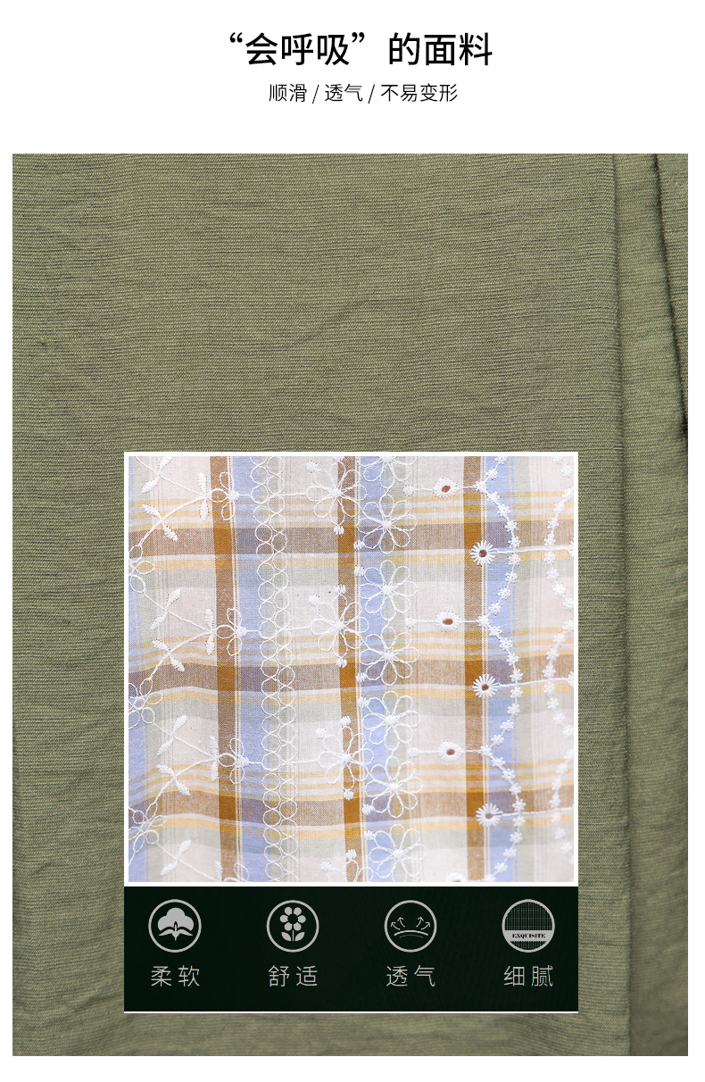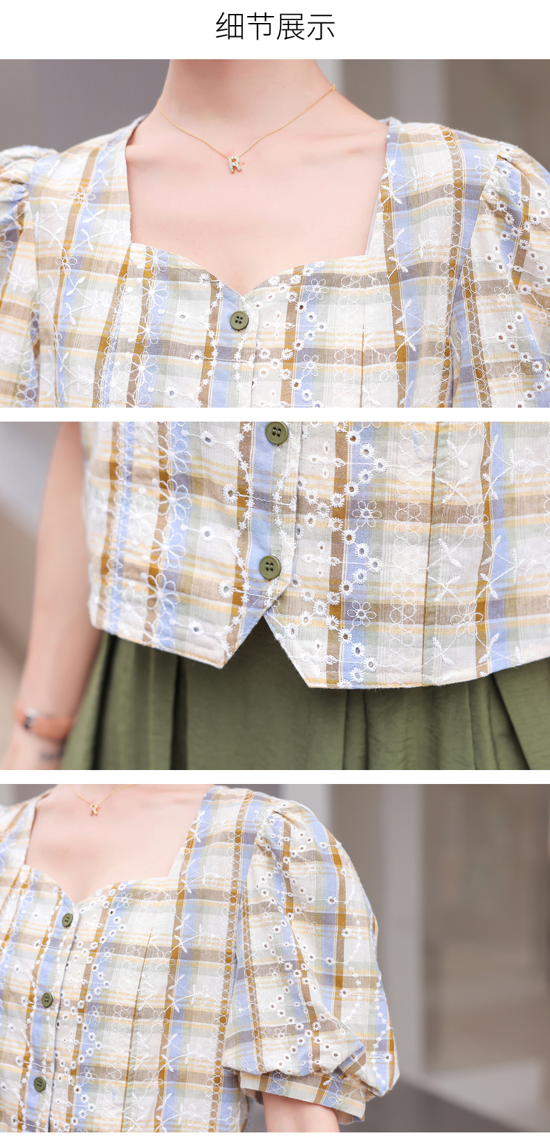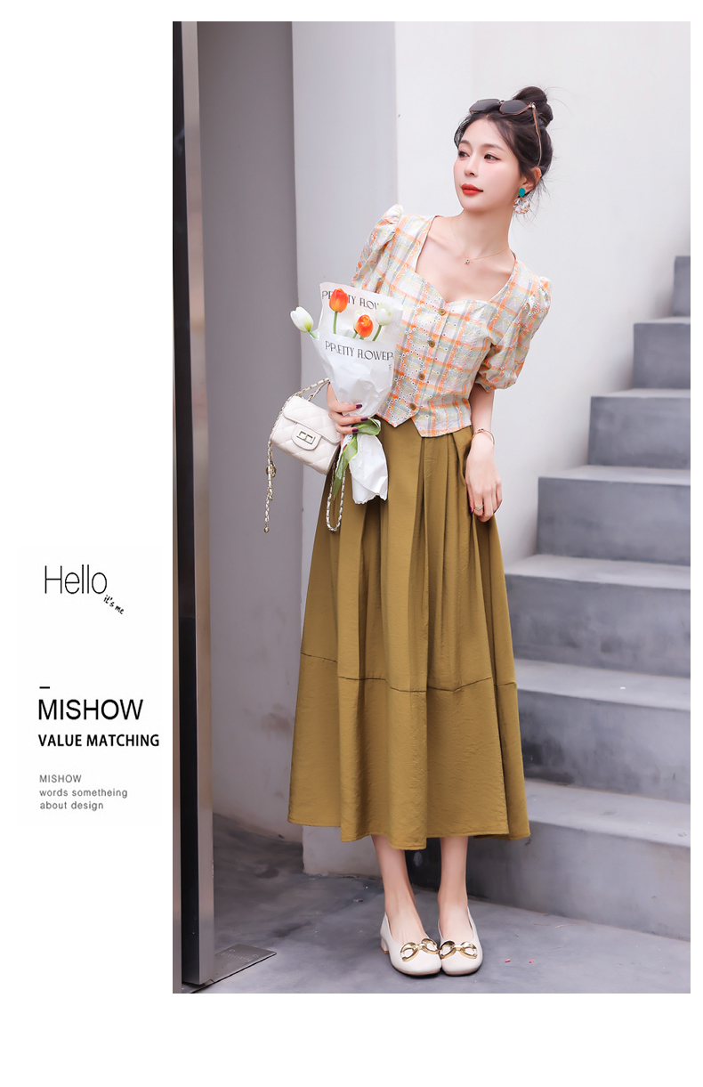 舒适棉麻,格子刺绣泡泡袖方领短袖上衣+纯色半裙套装HR-NSYY2306-5
