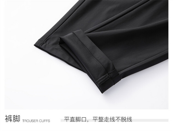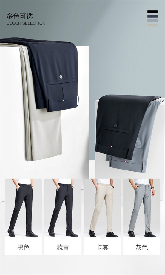 舒适用心好体验,人体工学-严格把控肢体形态的穿衣感, 给男士带来尊享体验 实况3D版型打造,修身设计 贴身舒适,独特的锦氨混纺,纤维塑形不束缚,轻松自由活动 弹力平整,抬脚不勒人;蹲下不紧绷,膝盖特殊处理不易变形,前裆不易褶皱